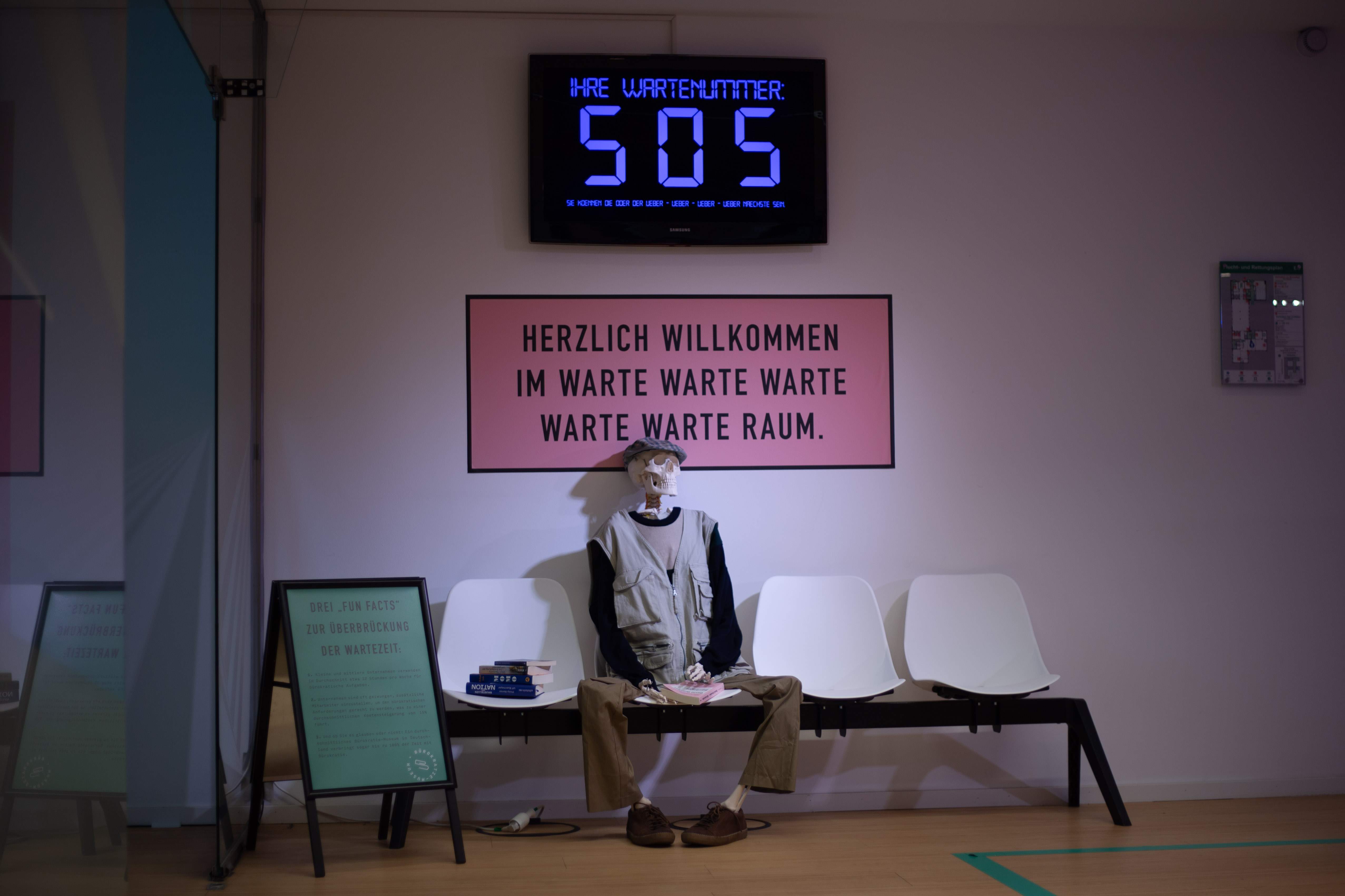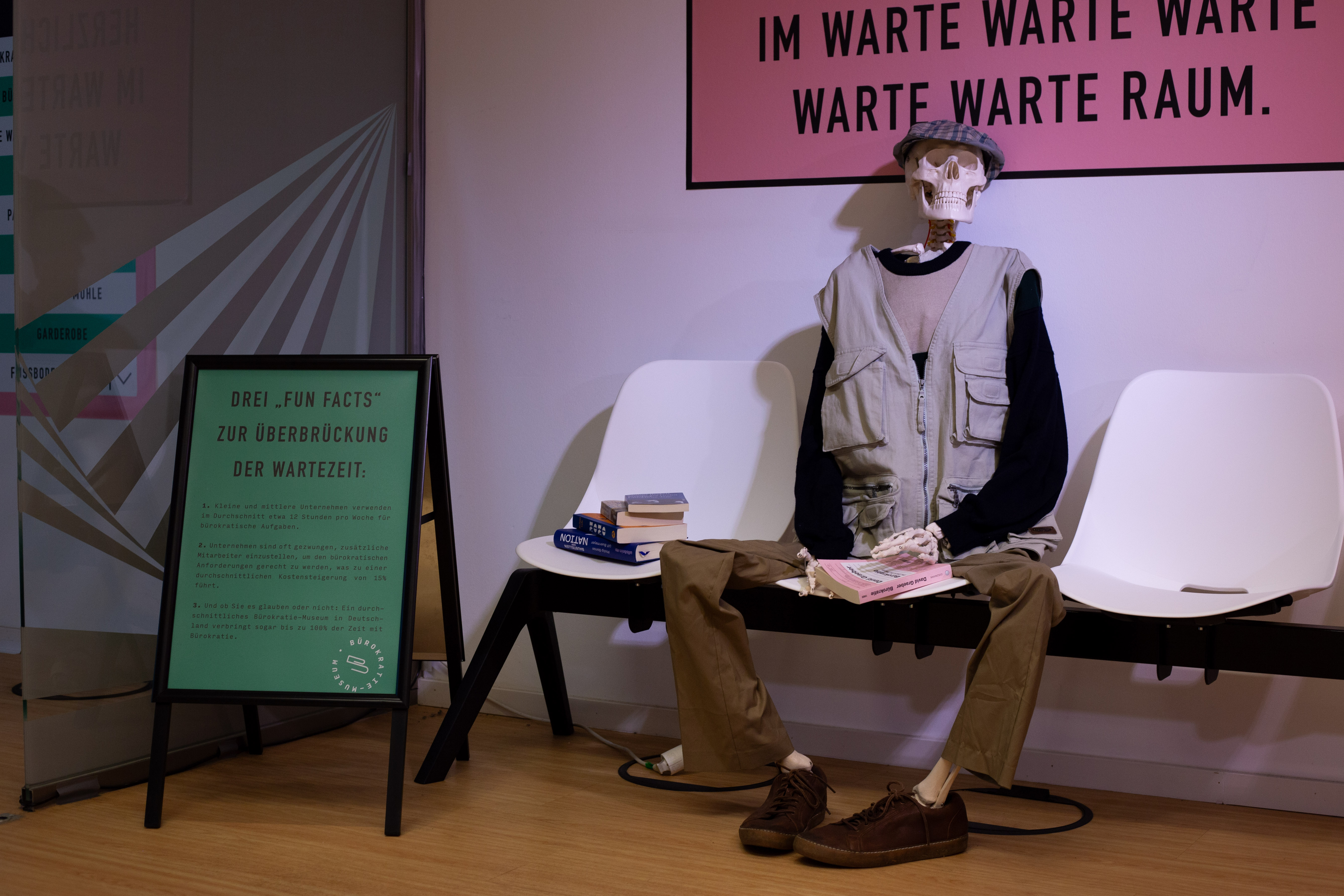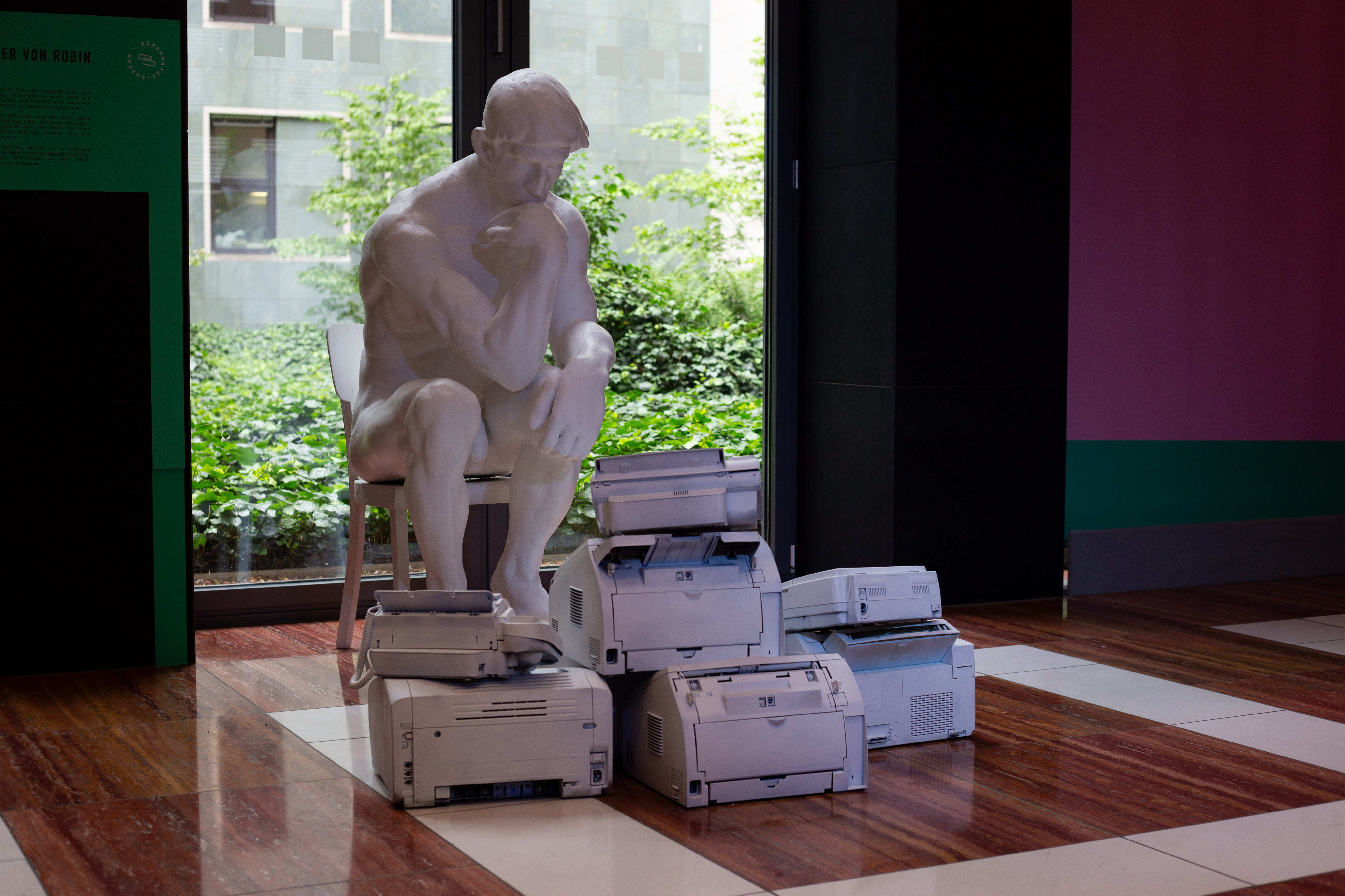 A white statue of a man seated on a chair, holding a book, is the central focus of the image. The statue is surrounded by a pile of white suitcases and boxes, suggesting a storage or display setting. The background features a large window with a view of a green building and a green wall, providing a contrast to the white statue. The image is taken from a low angle, emphasizing the statue's prominence. The colors are muted, with the white of the statue and suitcases, the green of the building and wall, and the gray of the floor and windows. The image does not provide any specific information about the landmark "sa_15547".