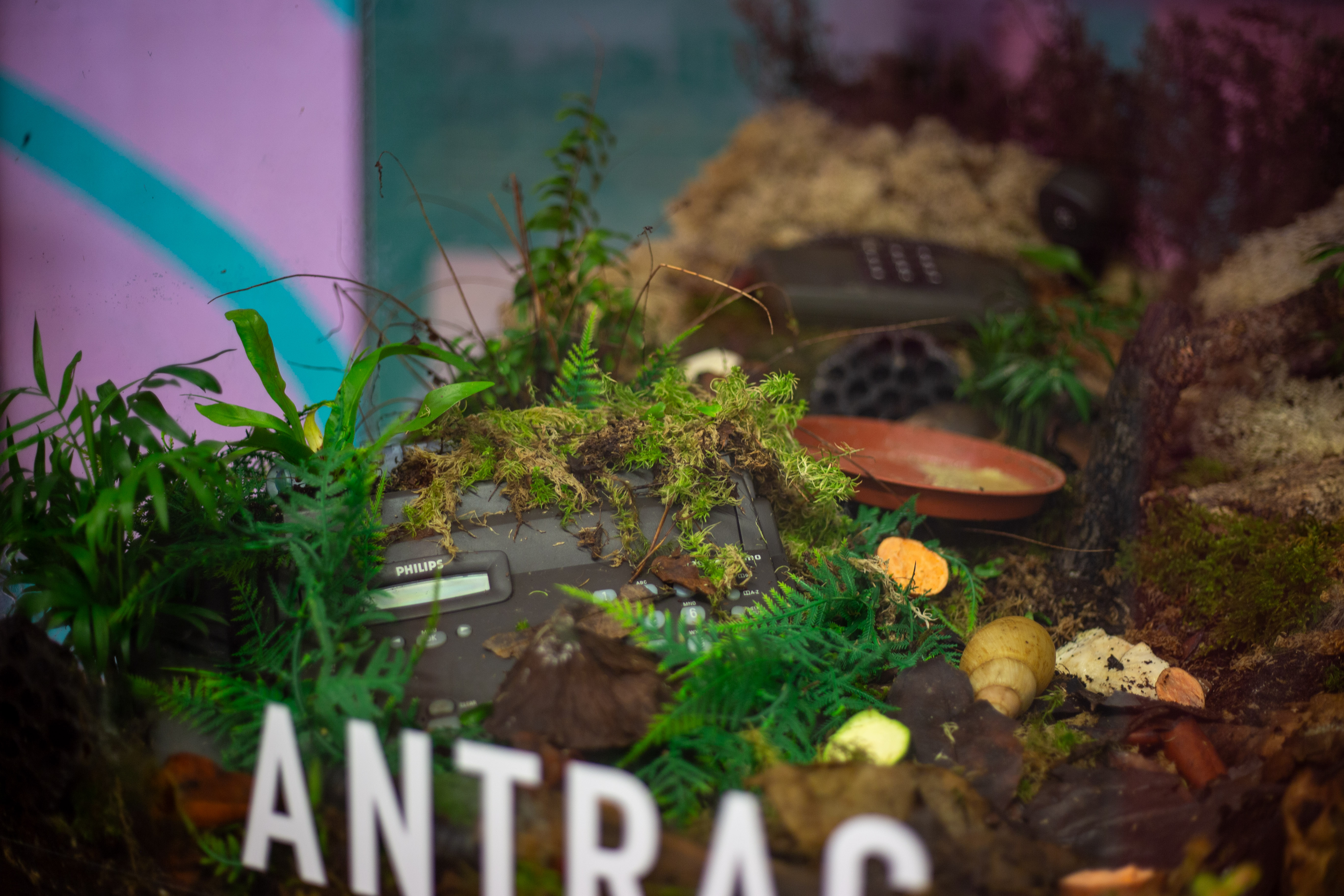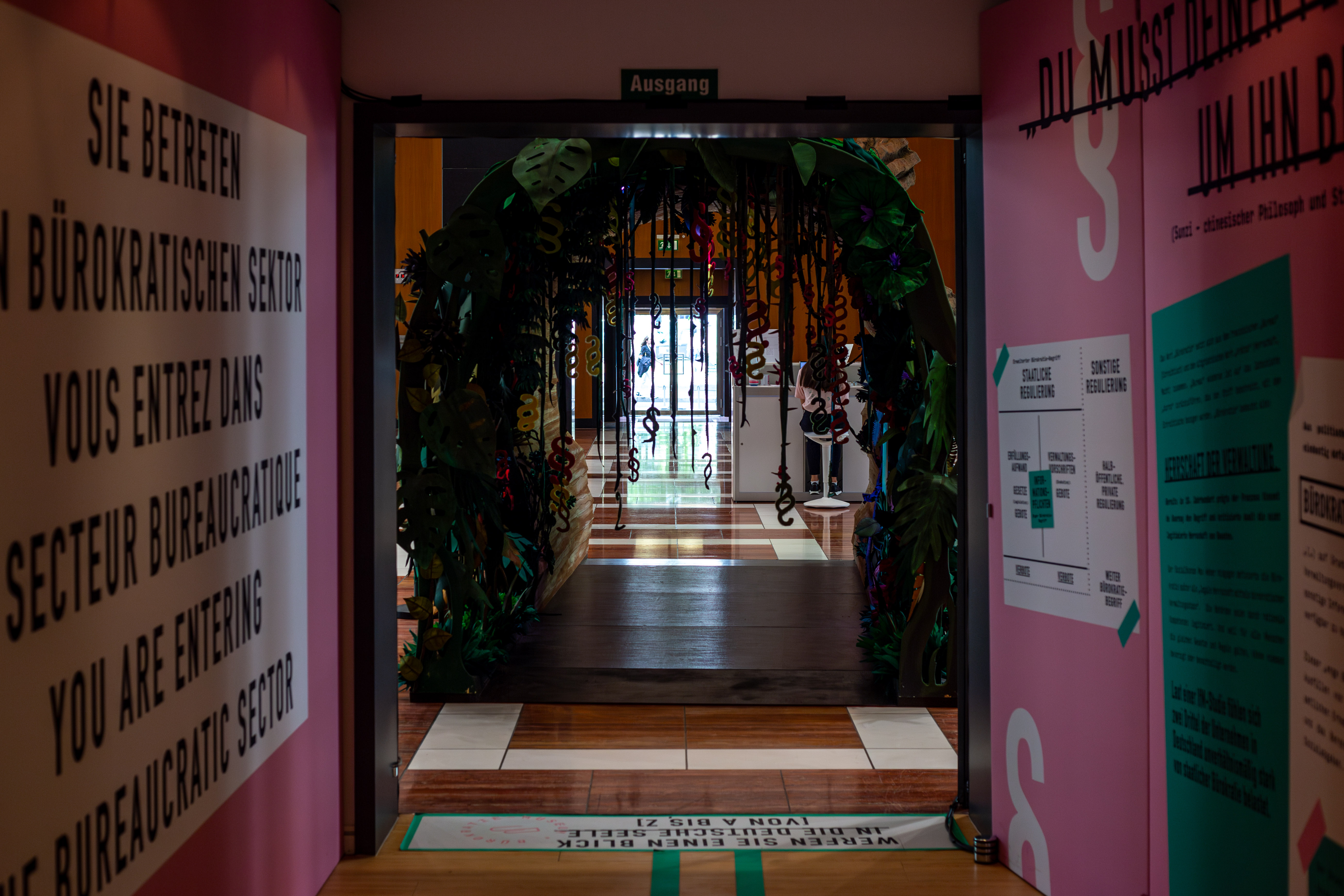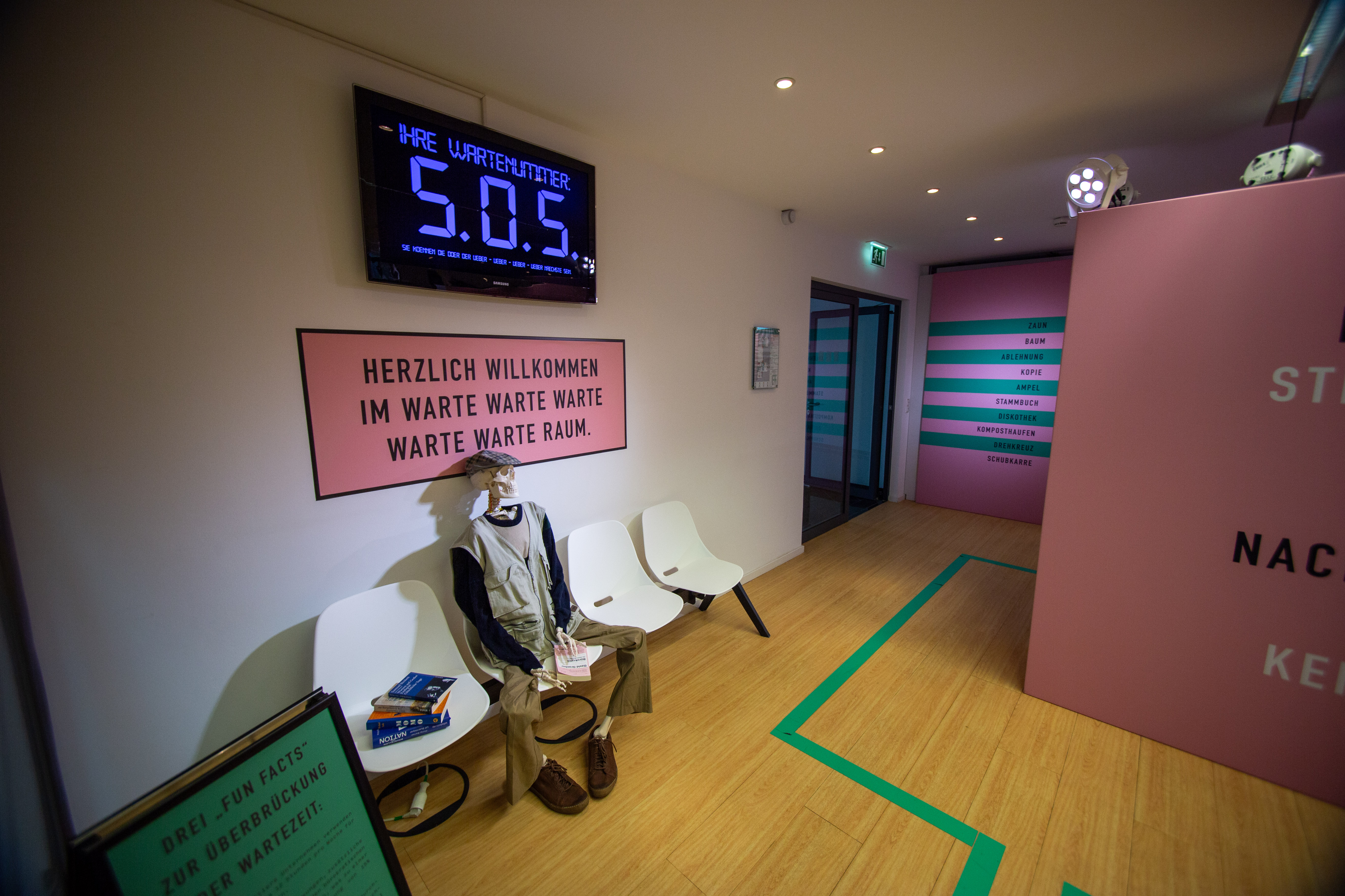 A white statue of a man seated on a chair, holding a book, is the central focus of the image. The statue is surrounded by a pile of white suitcases and boxes, suggesting a storage or display setting. The background features a large window with a view of a green building and a green wall, providing a contrast to the white statue. The image is taken from a low angle, emphasizing the statue's prominence. The colors are muted, with the white of the statue and suitcases, the green of the building and wall, and the gray of the floor and windows. The image does not provide any specific information about the landmark "sa_15547".