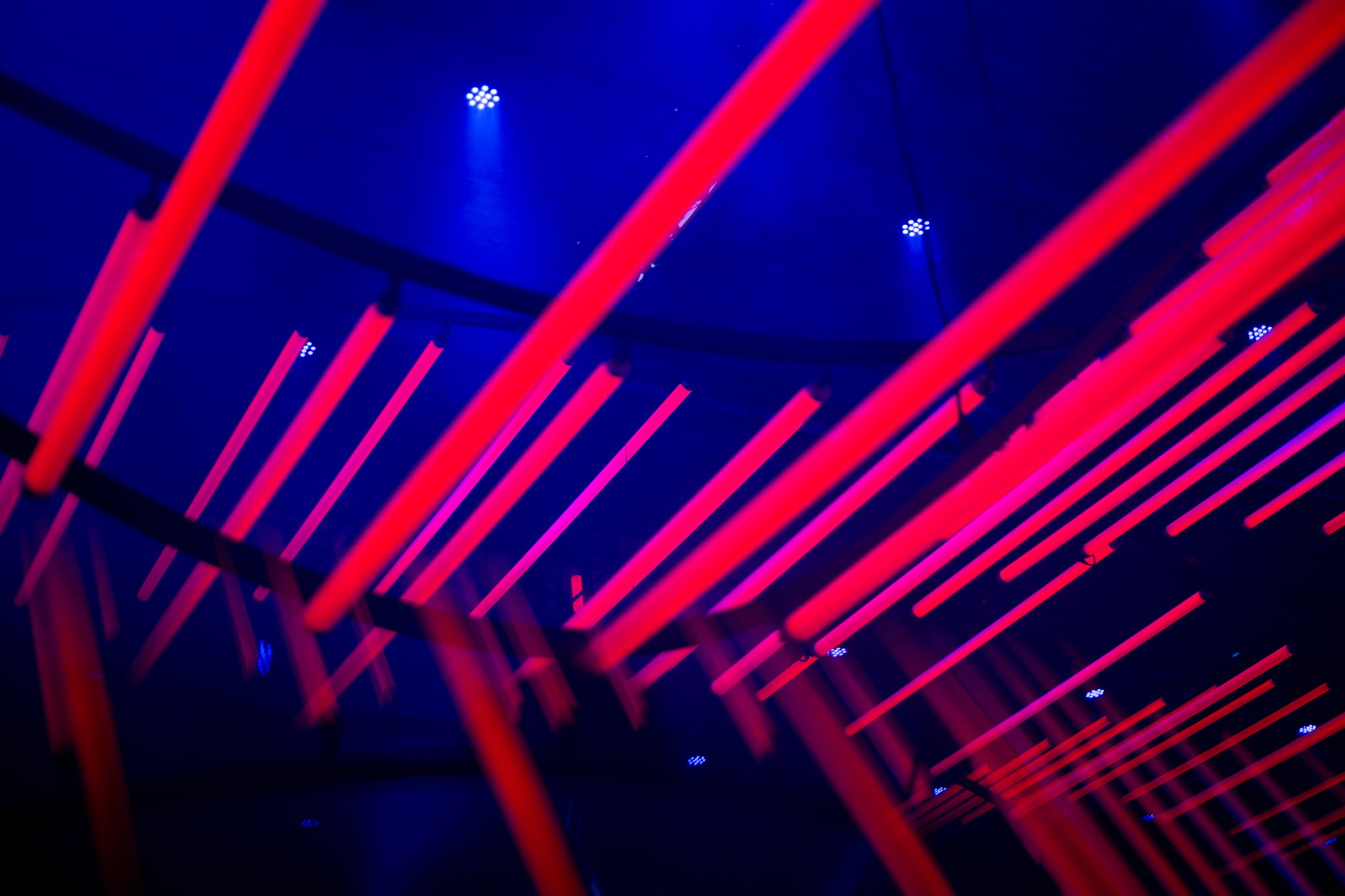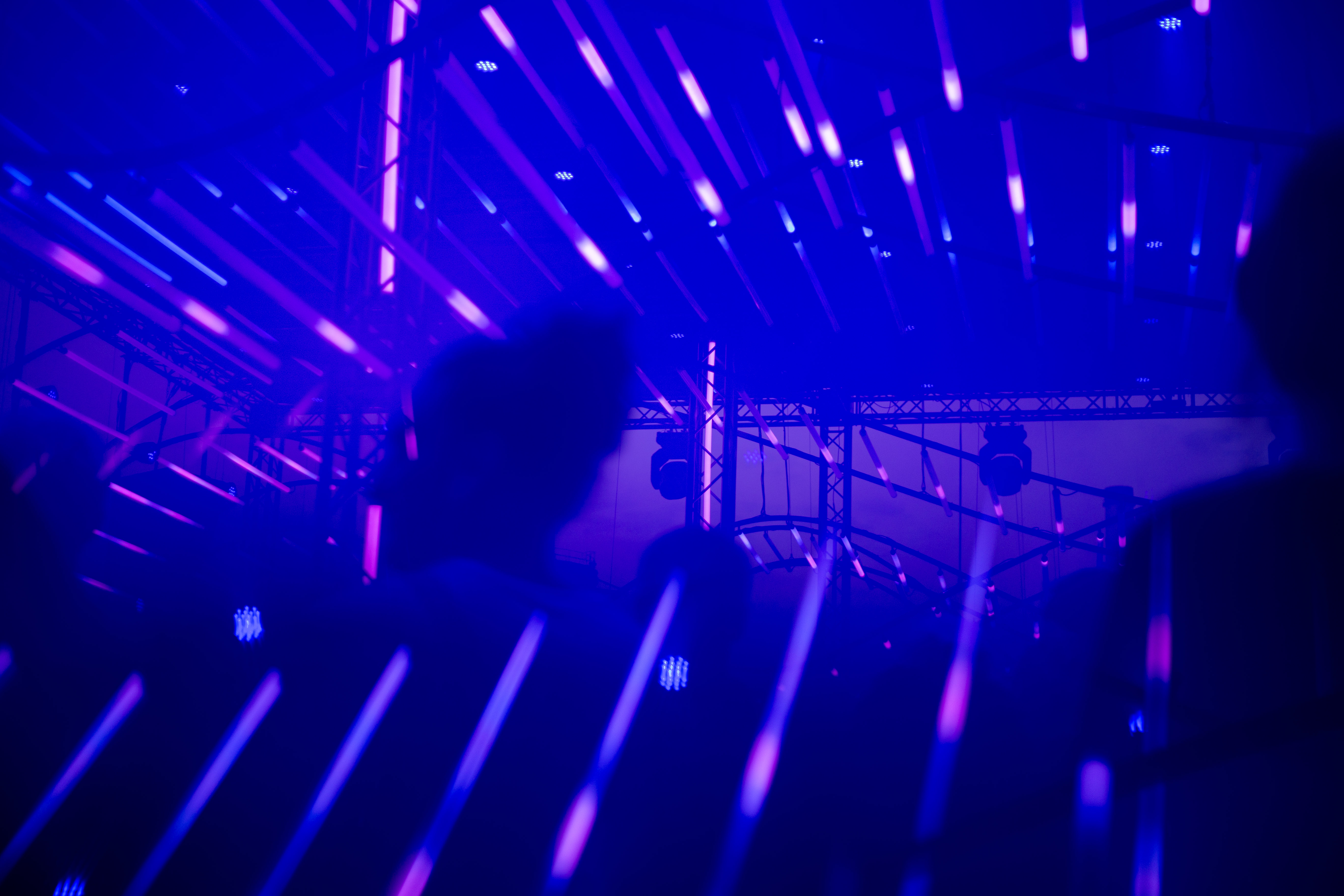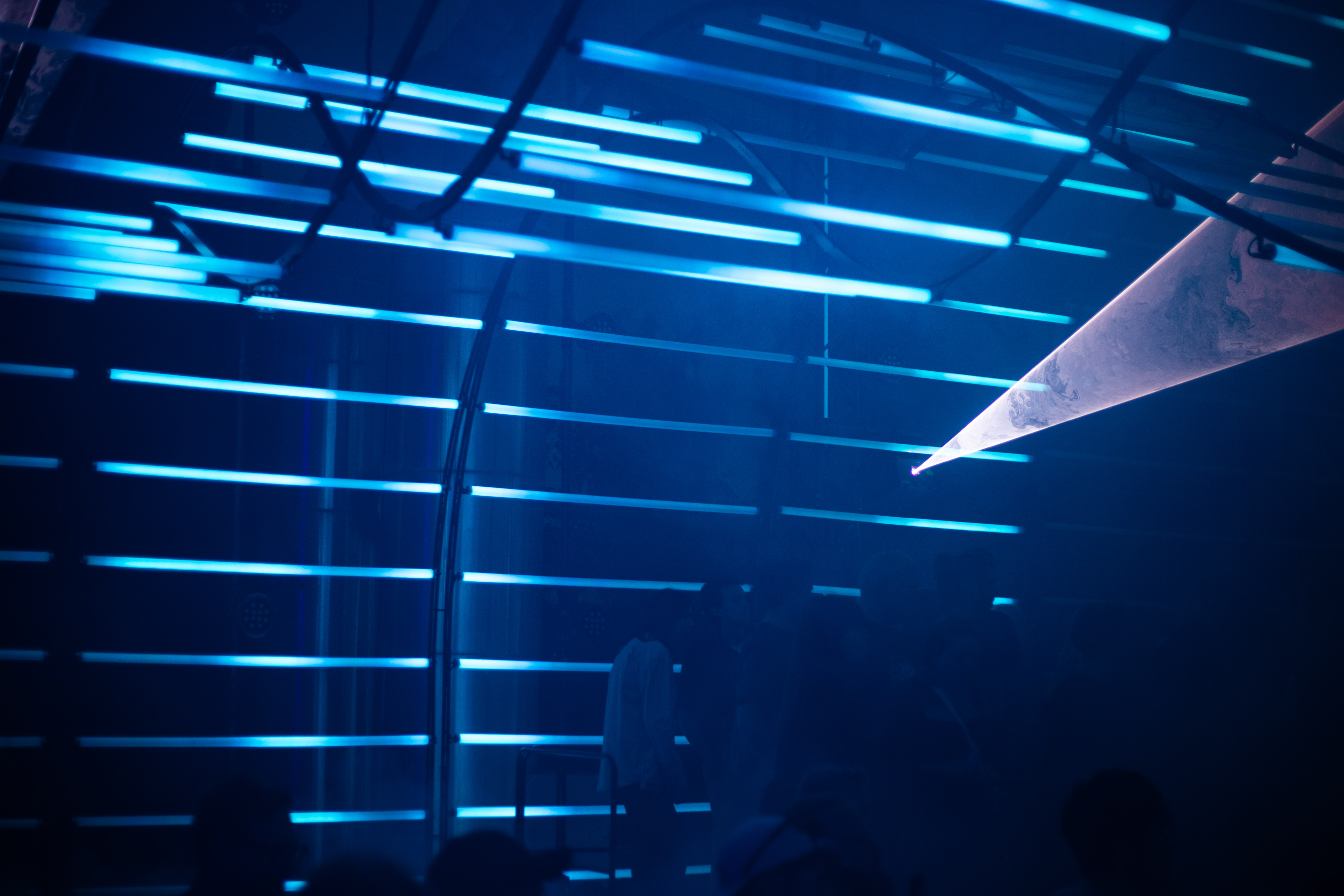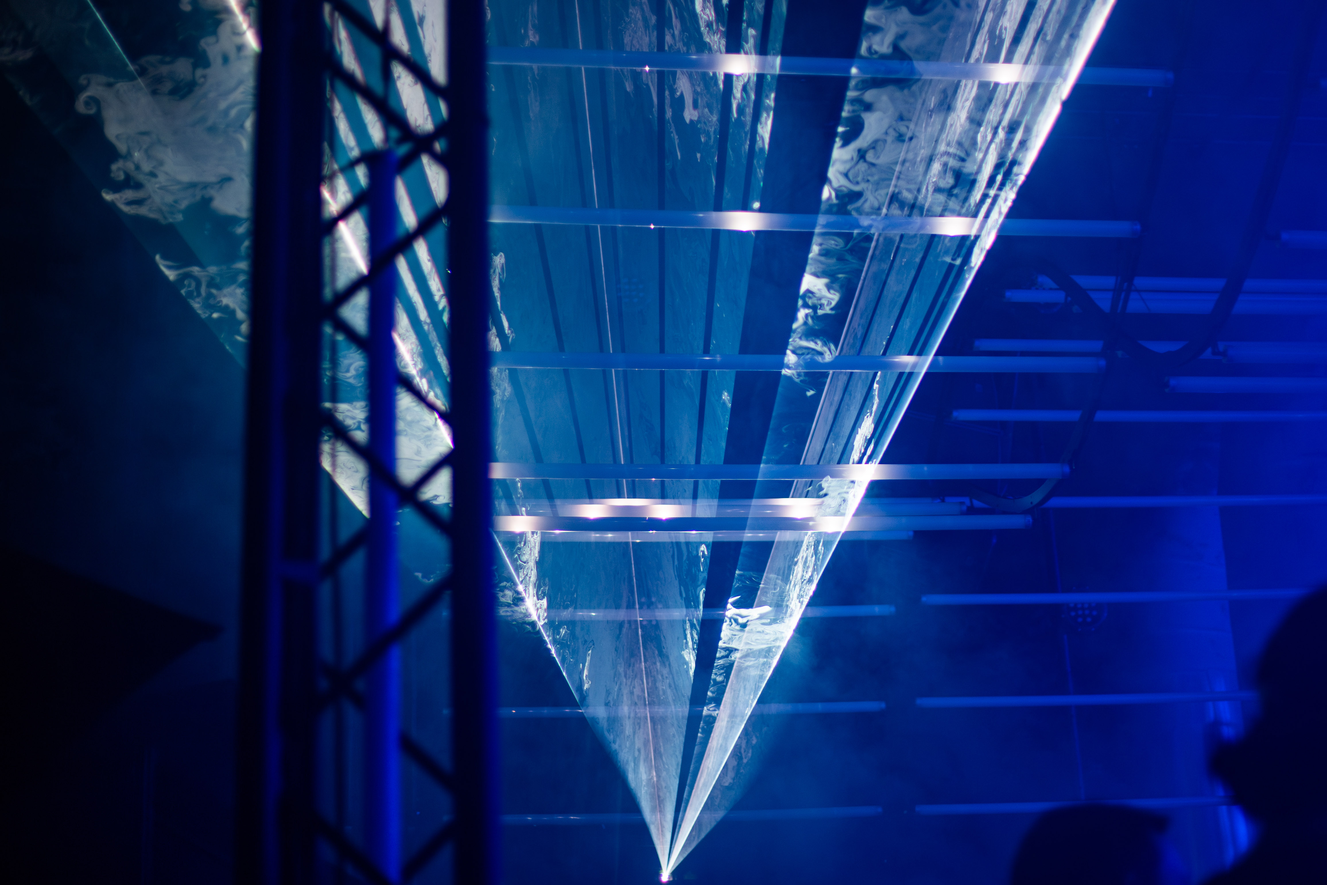 A dimly lit nightclub scene features a blue-lit ceiling with vertical lines, creating a mesmerizing effect. A white triangular object hangs from the ceiling, adding intrigue. The perspective is from the ground, looking up at the ceiling, emphasizing the height and grandeur of the structure. The image is taken from a low angle, emphasizing the height and grandeur of the ceiling. The landmark information "sa_15007" does not provide additional context to the image.
