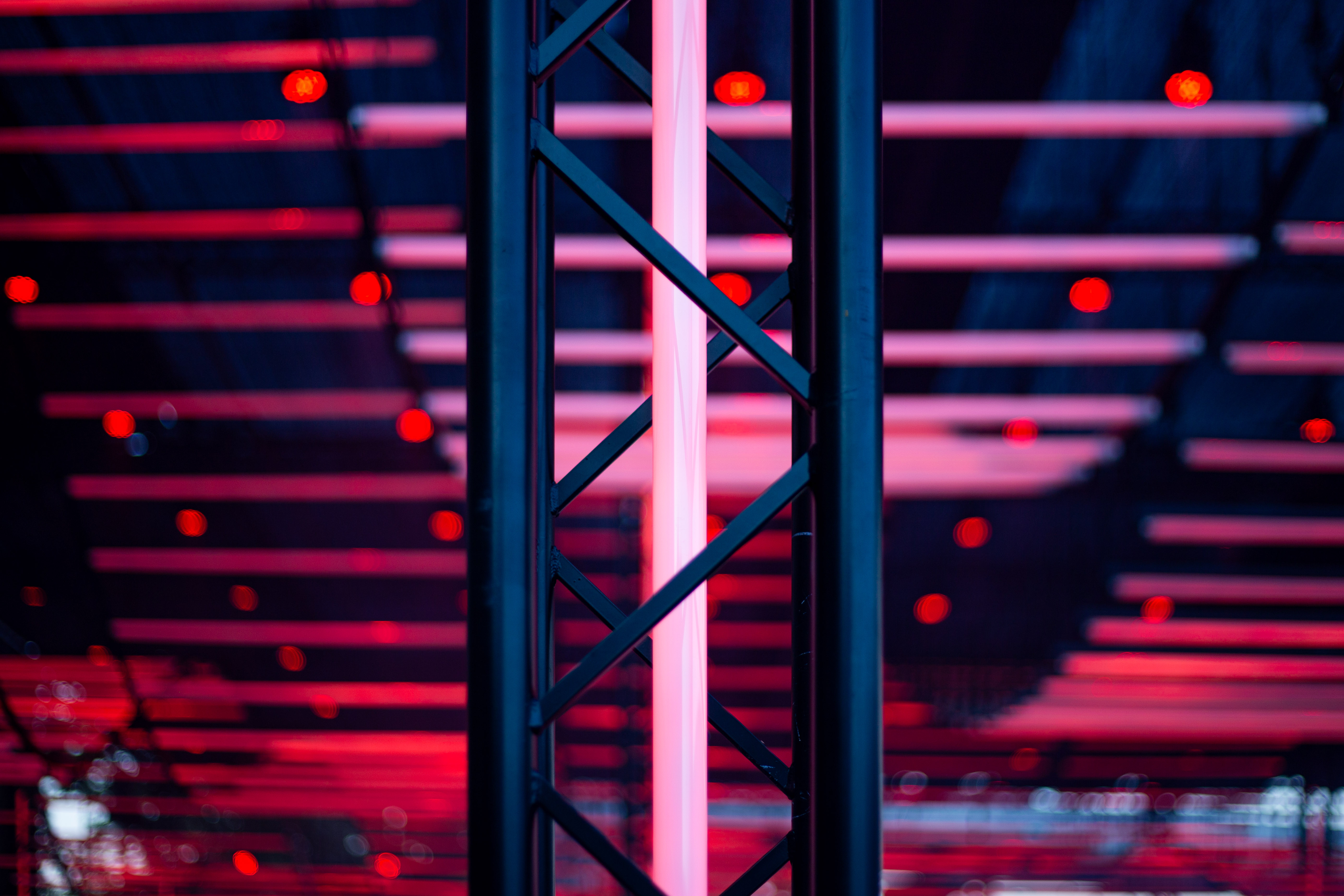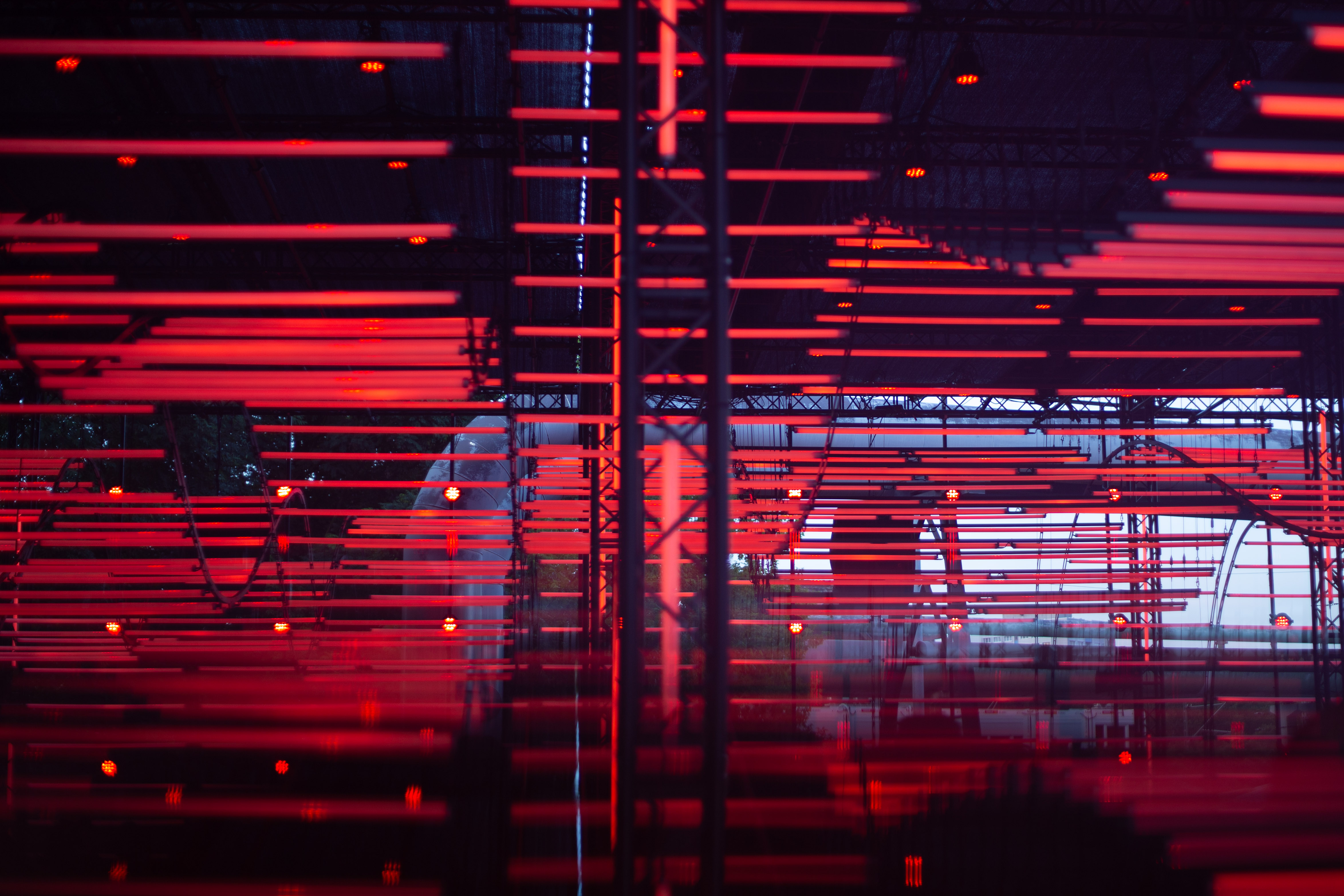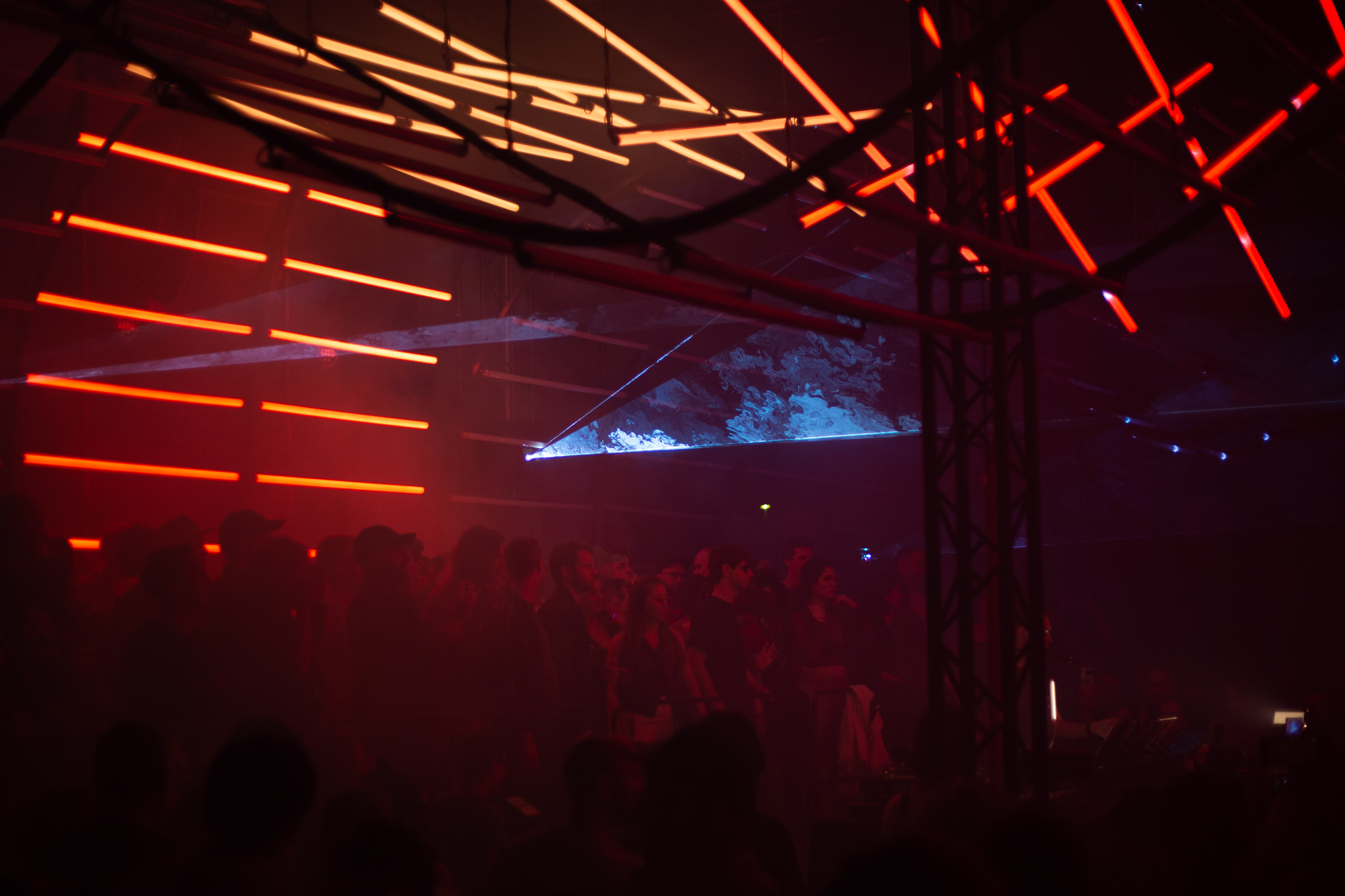 A dimly lit nightclub scene features a blue-lit ceiling with vertical lines, creating a mesmerizing effect. A white triangular object hangs from the ceiling, adding intrigue. The perspective is from the ground, looking up at the ceiling, emphasizing the height and grandeur of the structure. The image is taken from a low angle, emphasizing the height and grandeur of the ceiling. The landmark information "sa_15007" does not provide additional context to the image.