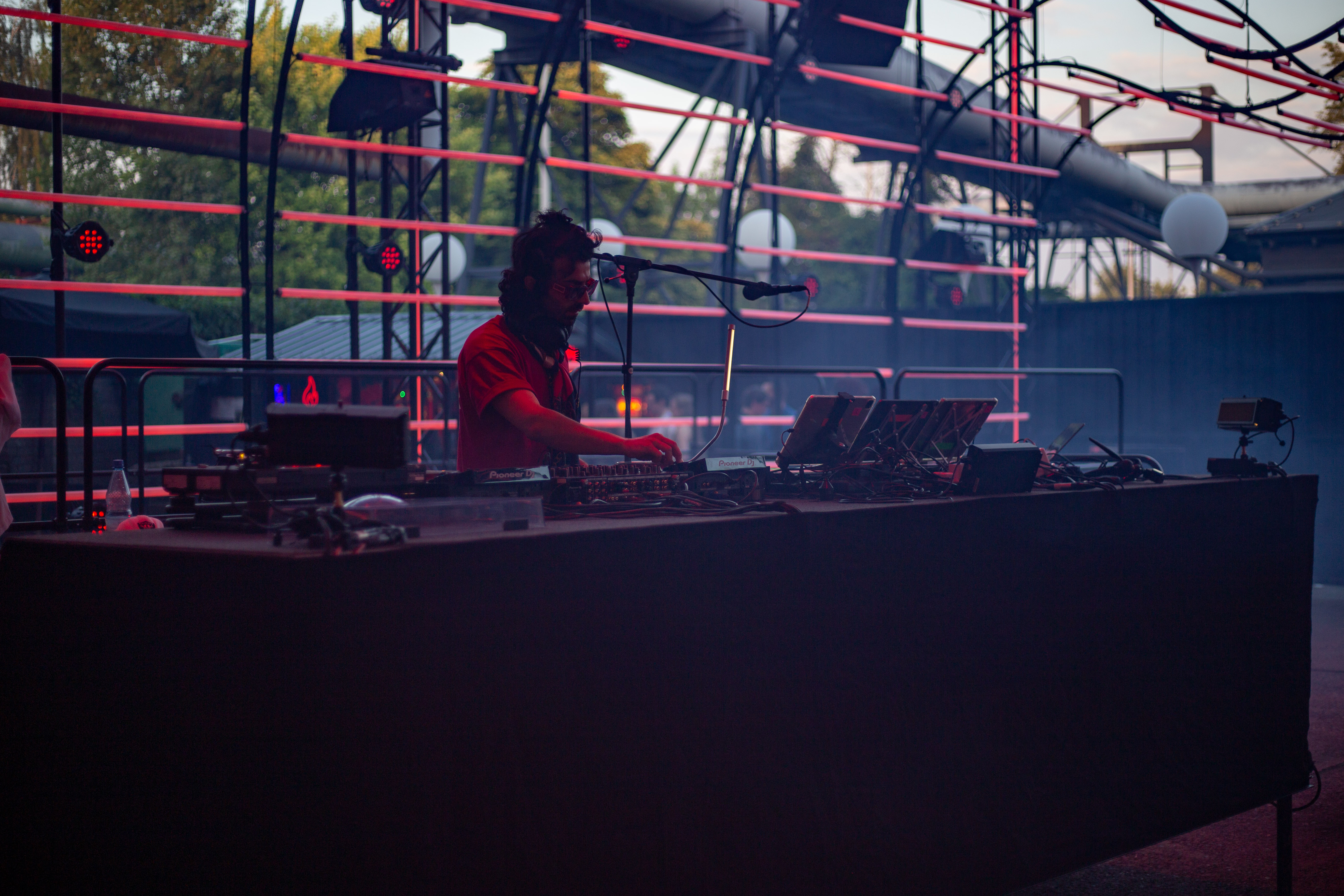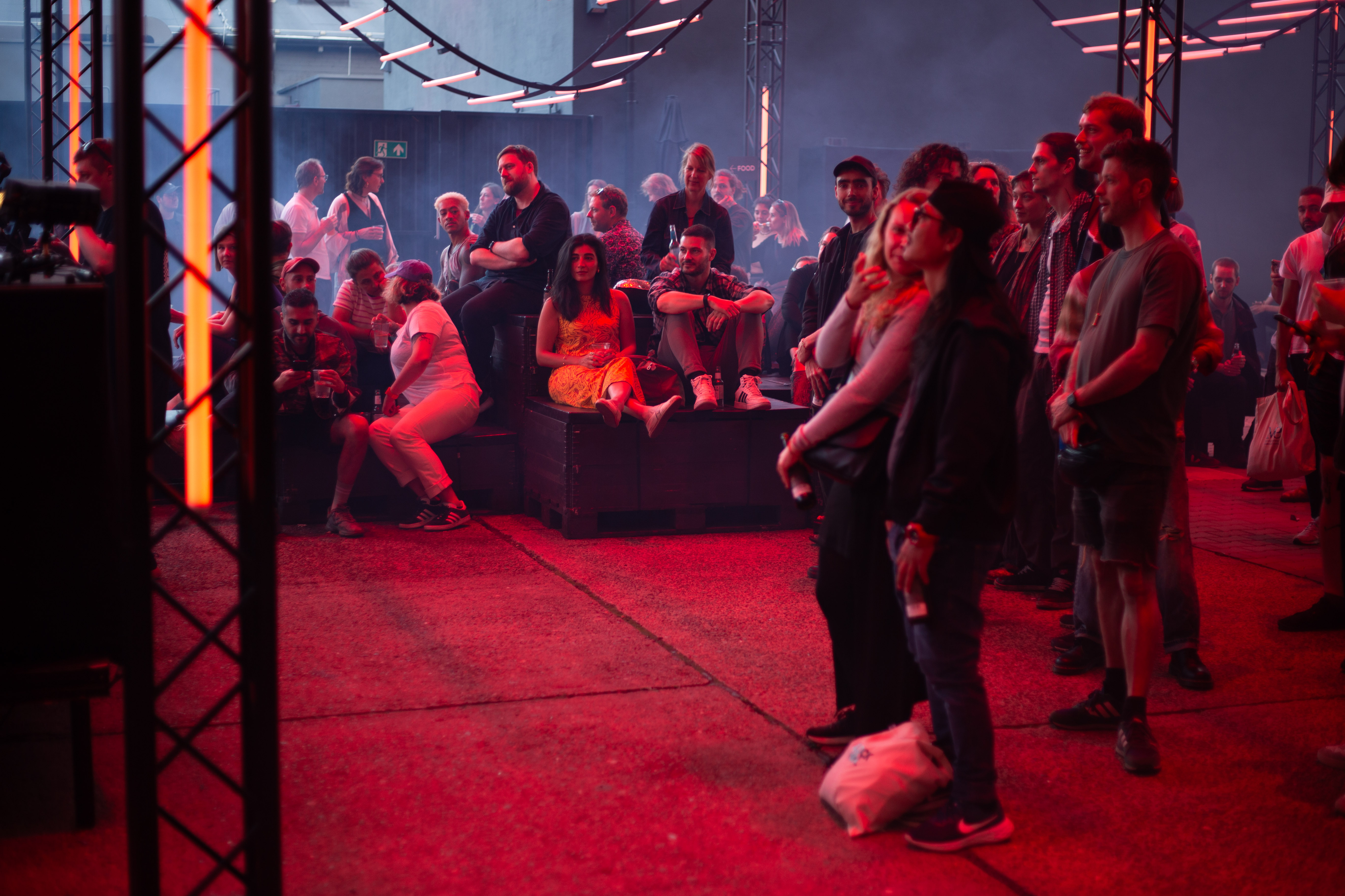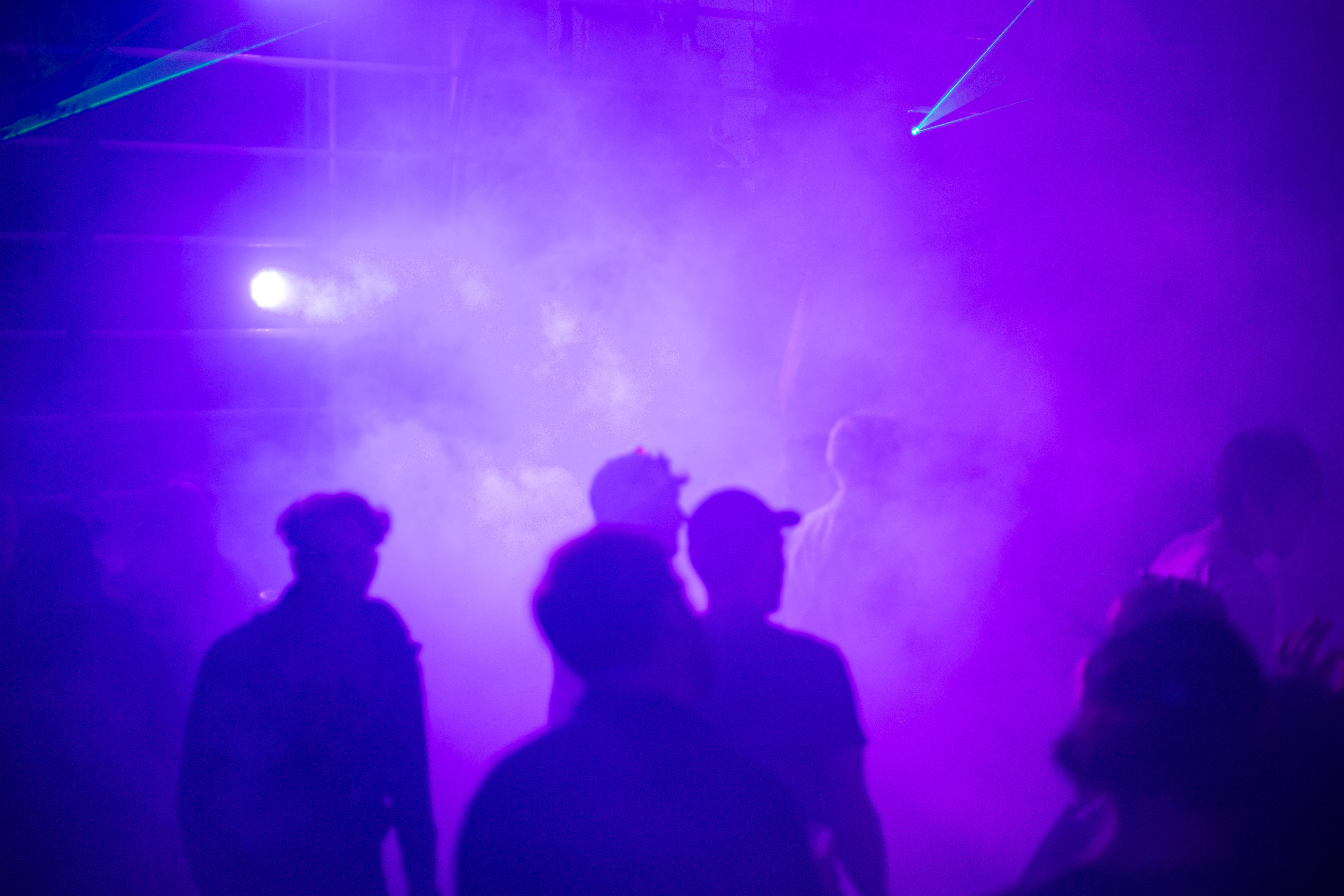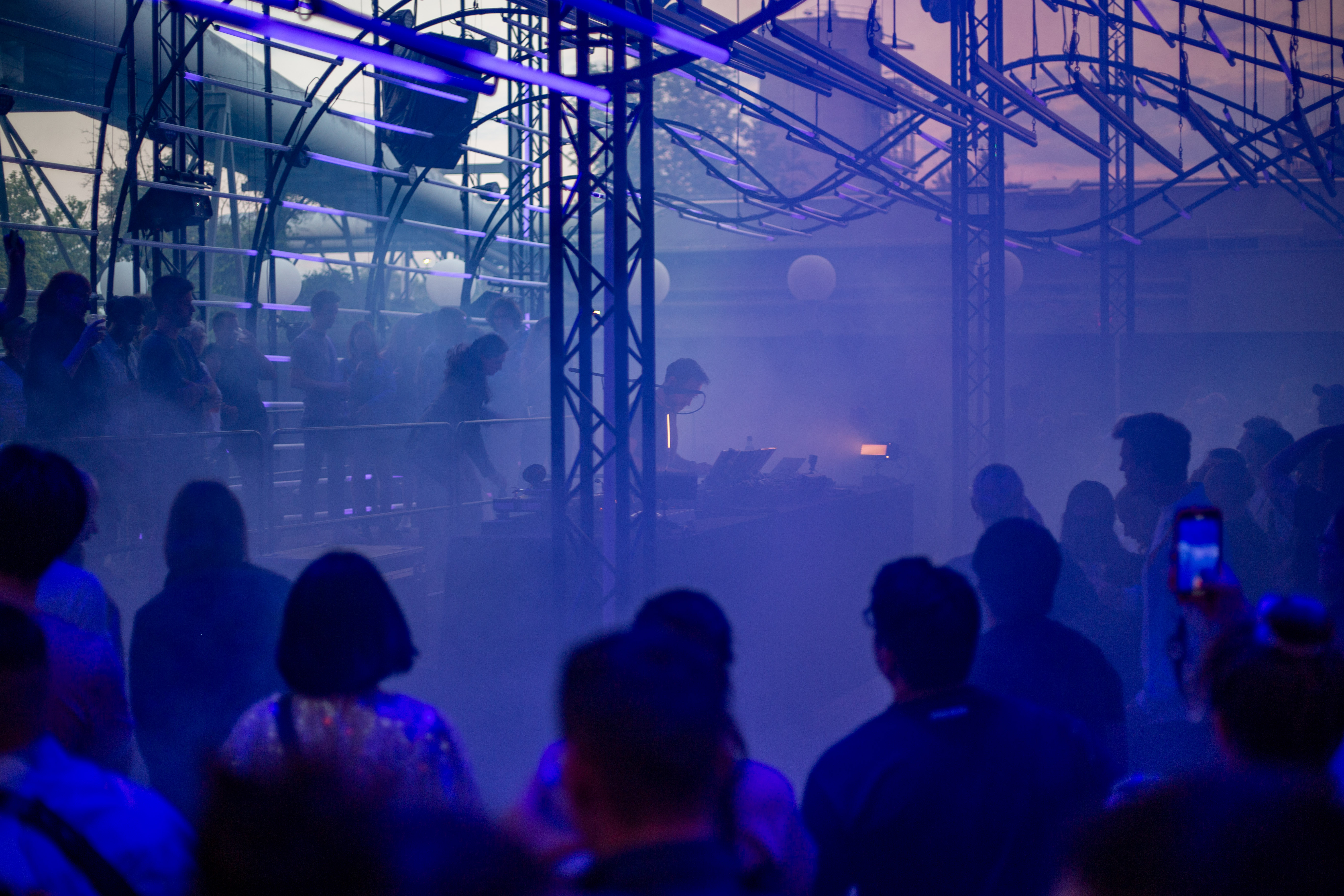 A dimly lit nightclub scene features a blue-lit ceiling with vertical lines, creating a mesmerizing effect. A white triangular object hangs from the ceiling, adding intrigue. The perspective is from the ground, looking up at the ceiling, emphasizing the height and grandeur of the structure. The image is taken from a low angle, emphasizing the height and grandeur of the ceiling. The landmark information "sa_15007" does not provide additional context to the image.