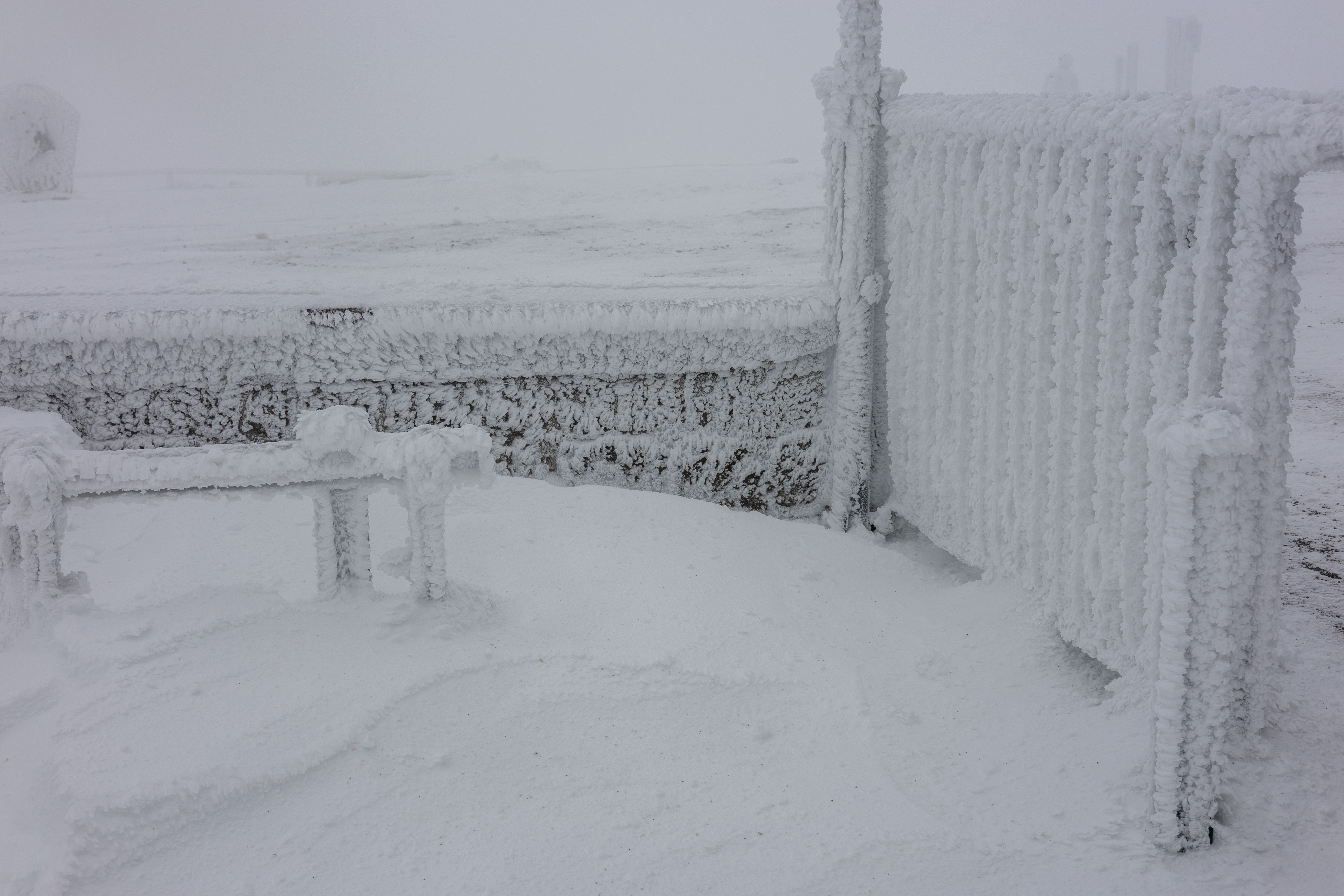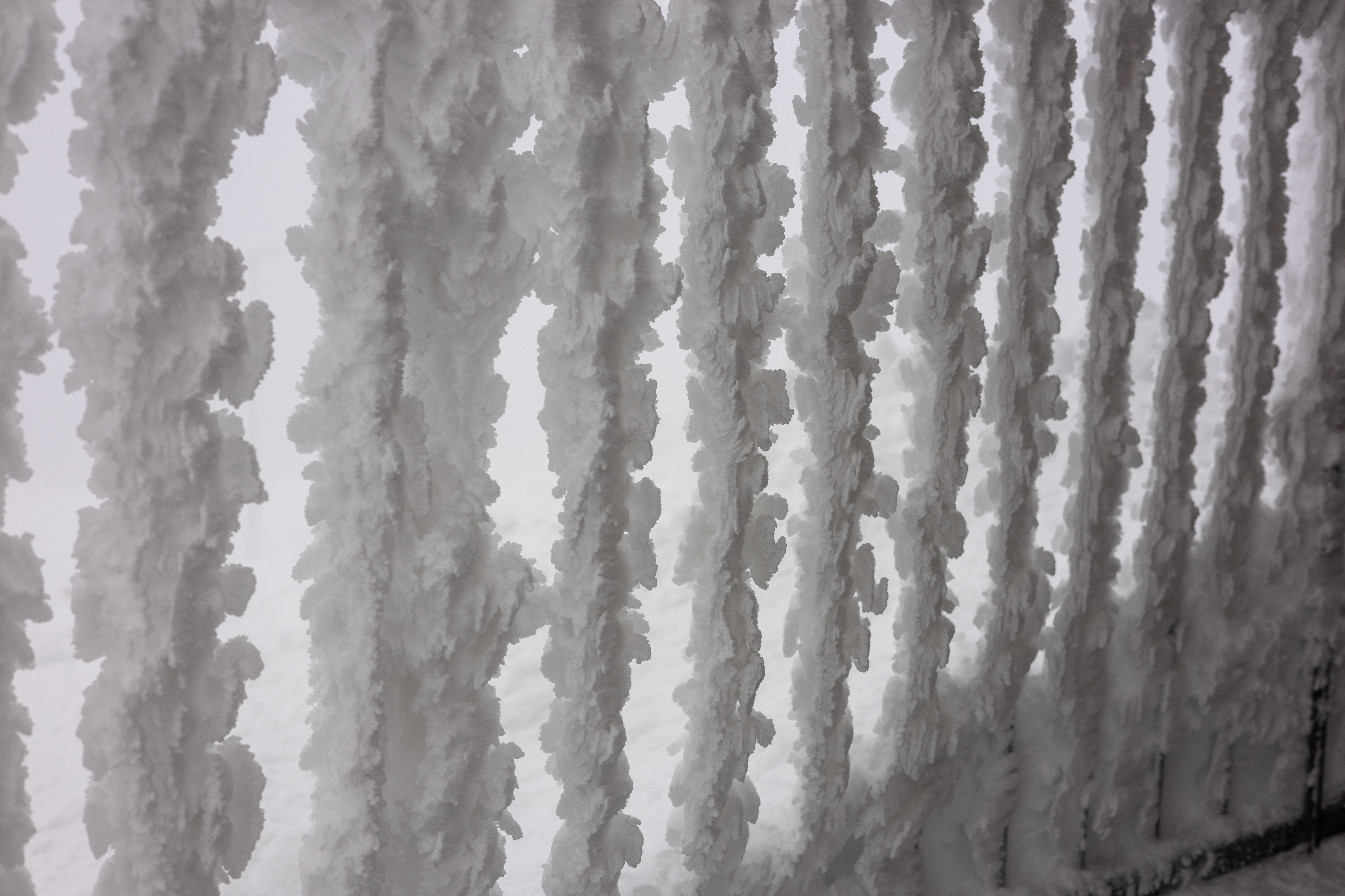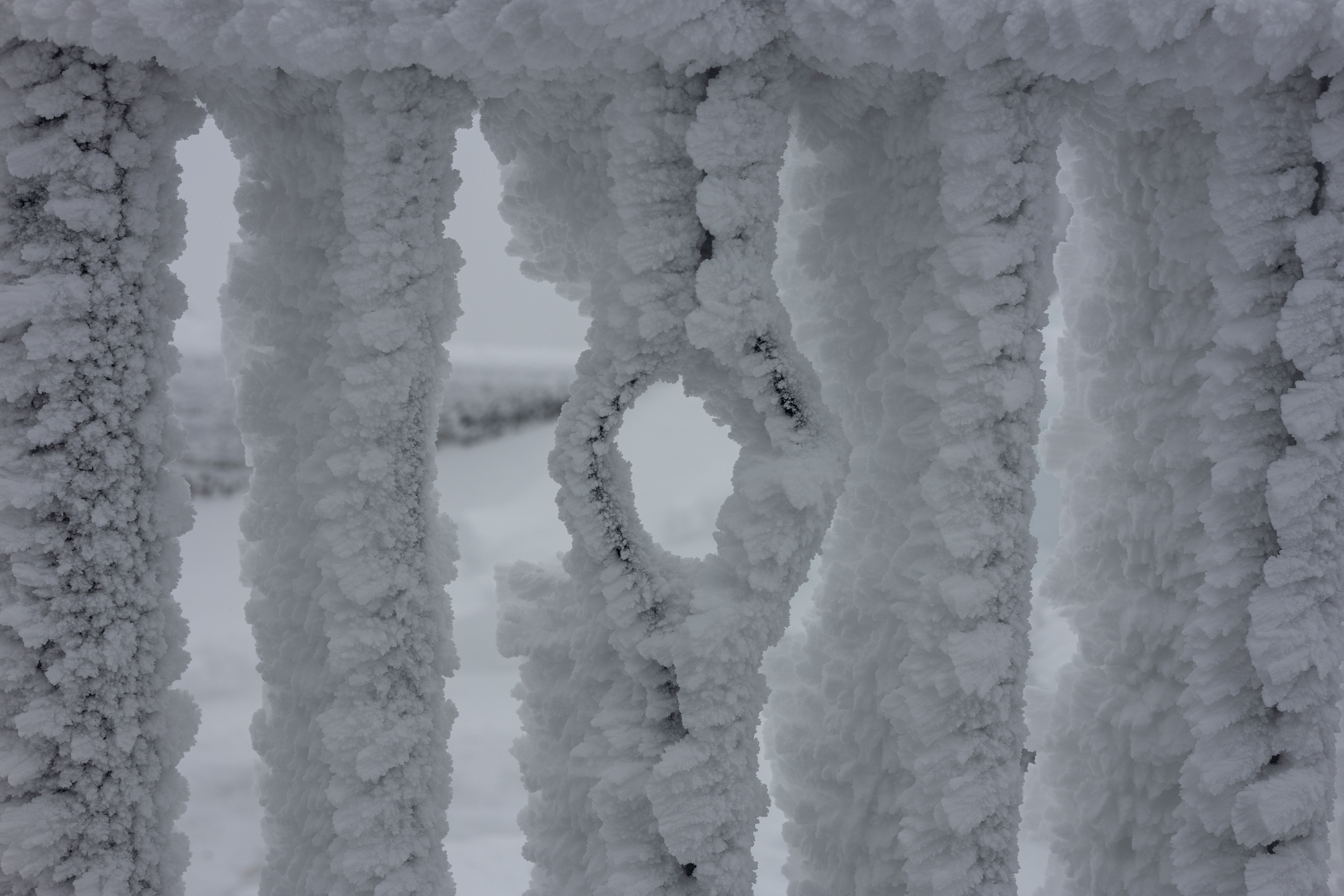 A close-up view of a frozen metal railing, adorned with icicles, is captured in a serene winter scene. The railing, covered in a thick layer of ice, is the central focus of the image. The icicles, in various shapes and sizes, are scattered across the railing, creating a sense of depth and texture. The background, blurred and indistinct, provides a stark contrast to the intricate details of the railing. The image does not contain any discernible text or countable objects. The relative positions of the icicles vary, with some appearing closer to the viewer and others further away. The image does not provide any information about the time of day or the location. The image is a still life, capturing a still moment in a winter landscape.