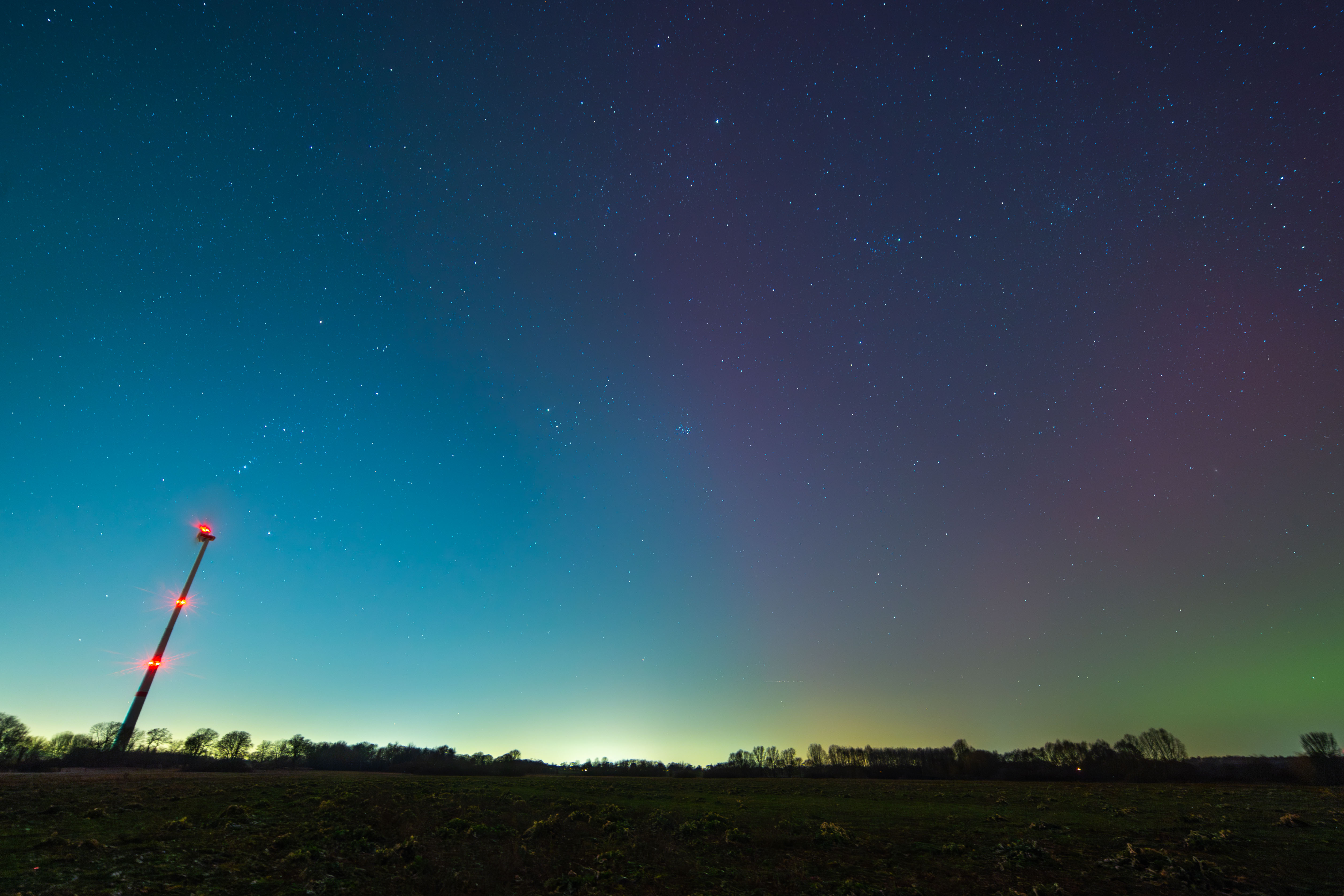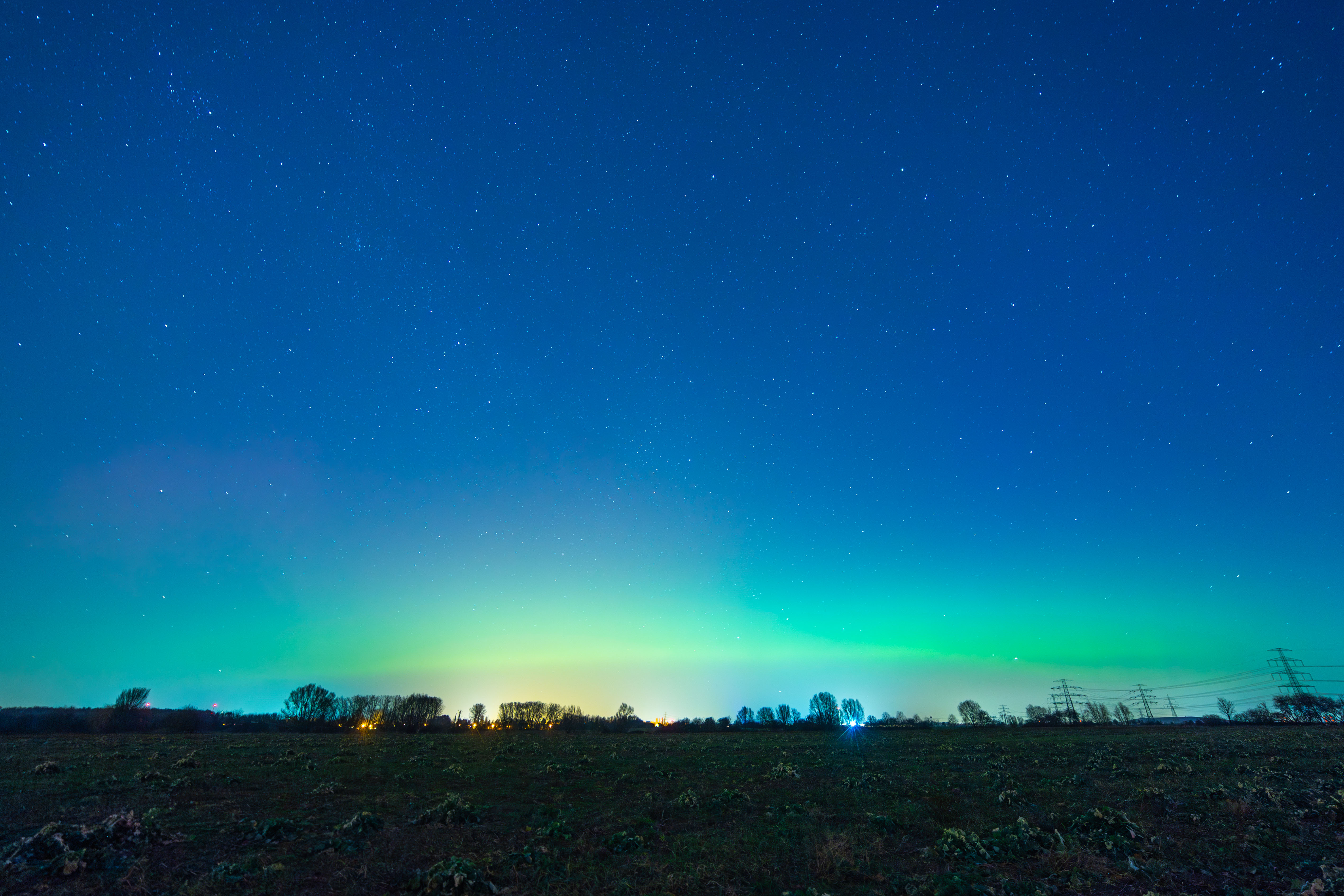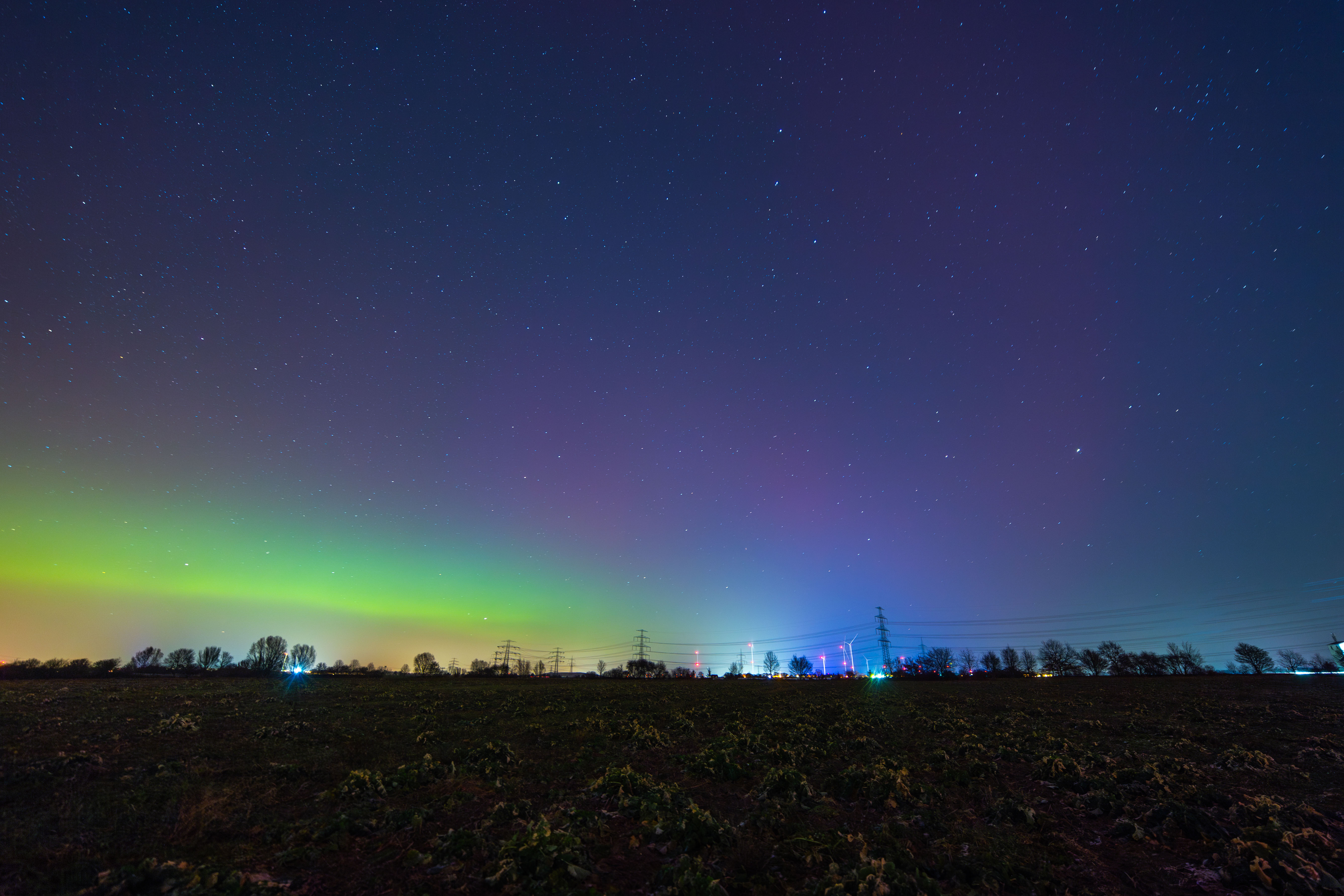 The image captures the breathtaking view of the aurora borealis, a vibrant display of colors against a dark sky. The aurora, a large, colorful cloud, stretches across the sky, its hues of red, orange, yellow, green, blue, and purple creating a mesmerizing spectacle. The sky is a deep blue, dotted with stars that add depth and dimension to the scene. In the foreground, a field of green plants stretches out, providing a stark contrast to the colorful aurora. Power lines crisscross the sky, adding a touch of modernity to the natural landscape. The image is taken from a low angle, emphasizing the grandeur of the aurora and the vastness of the sky. The identifier "sa_1500" does not provide additional information about the landmark.