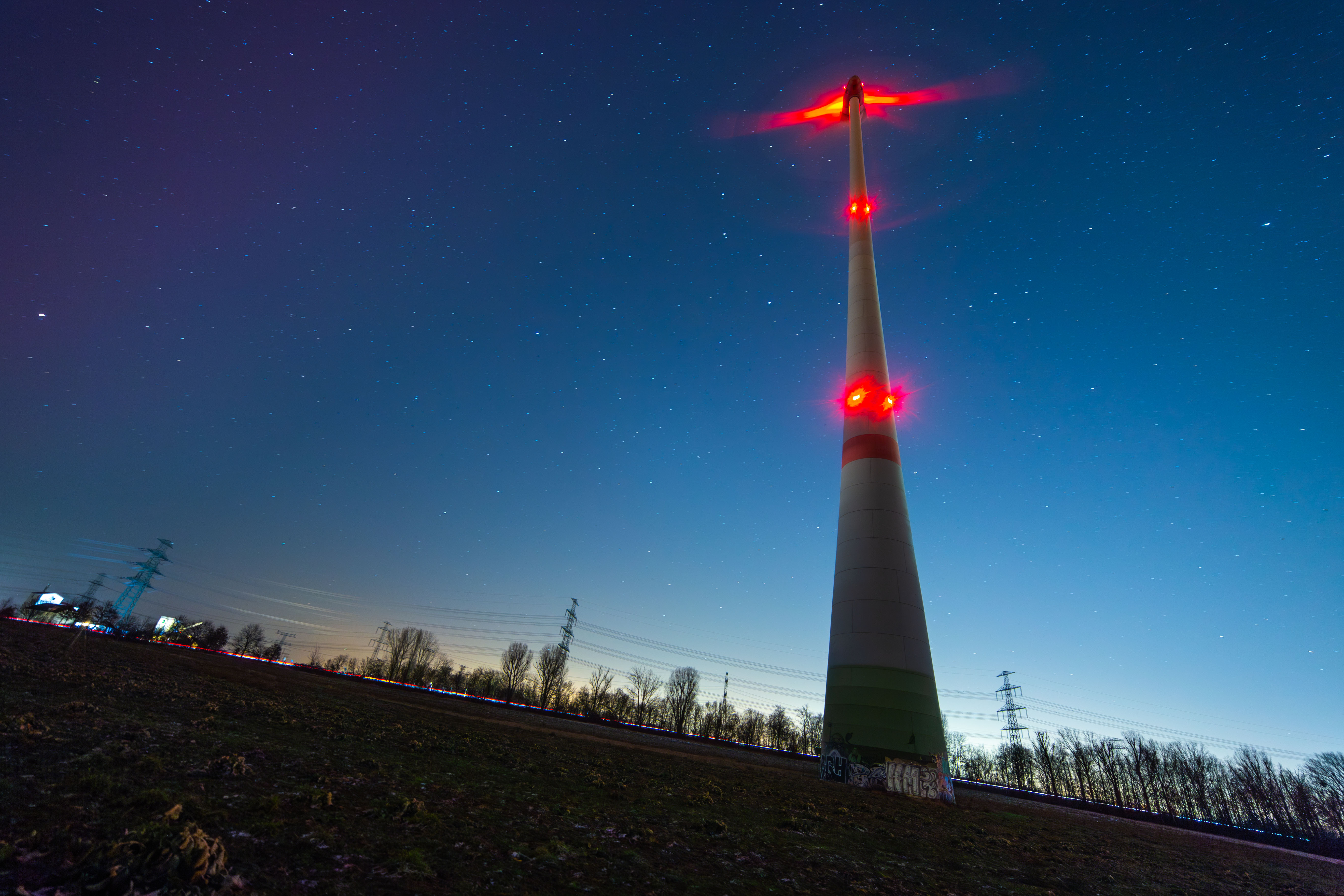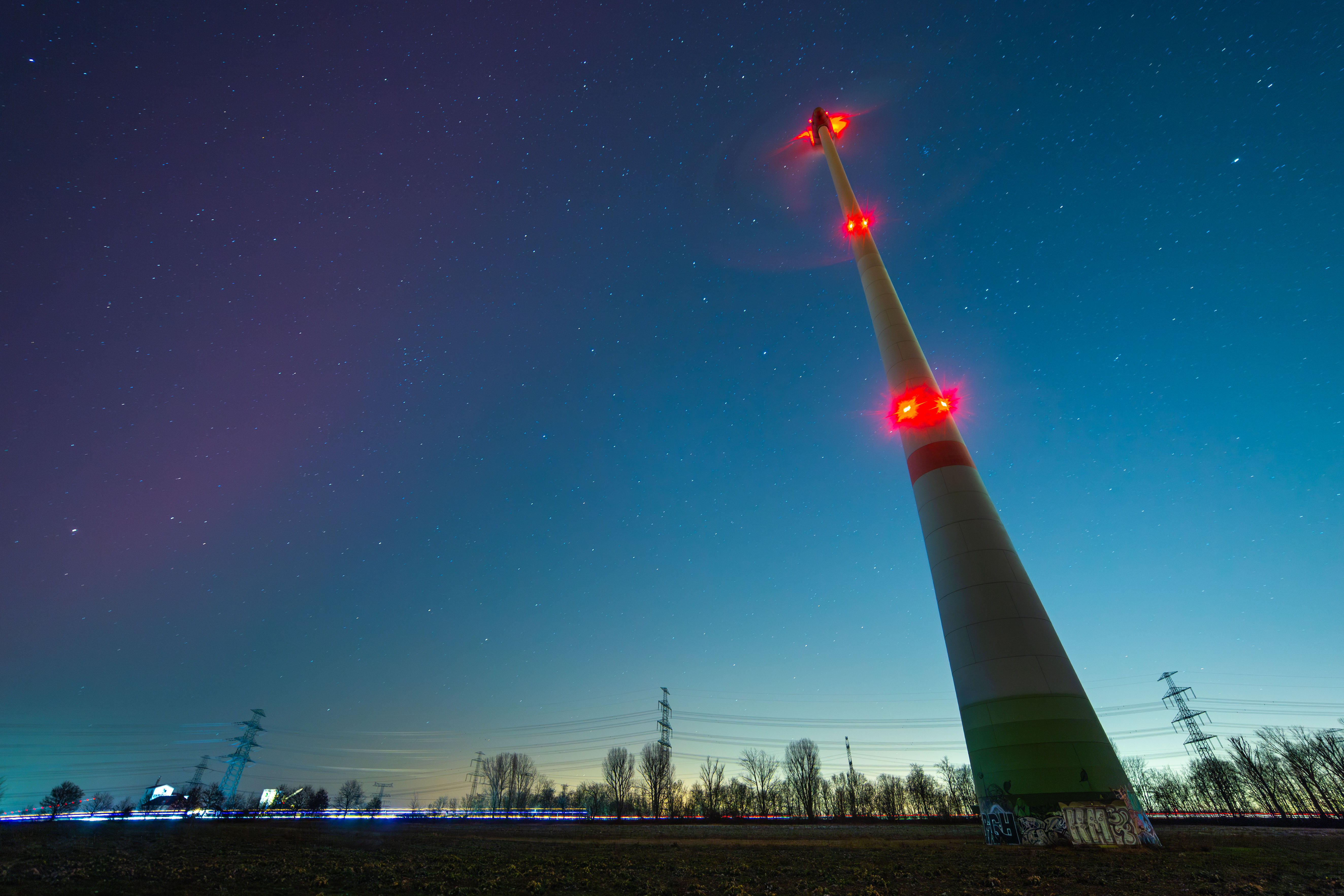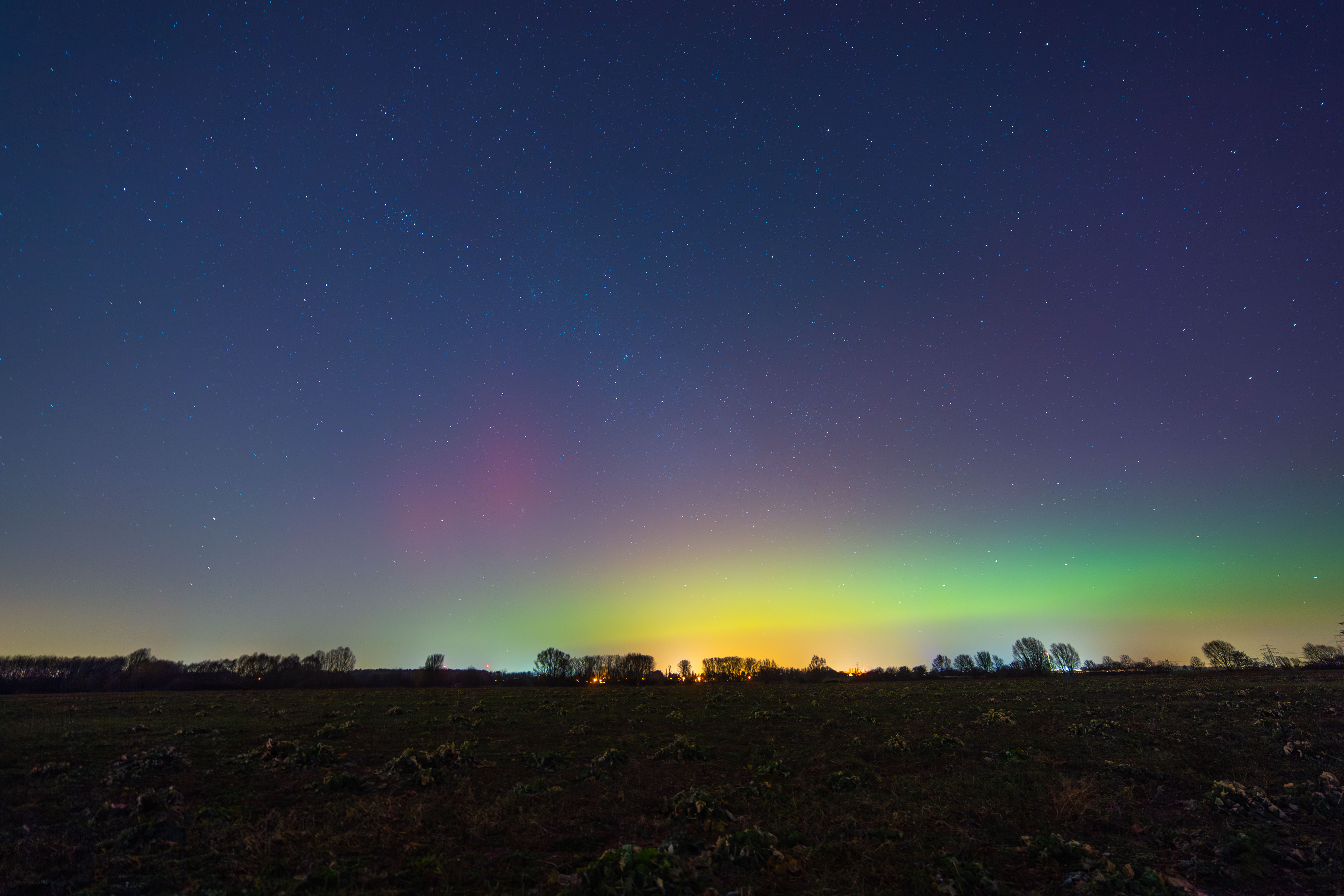 The image captures the breathtaking view of the aurora borealis, a vibrant display of colors against a dark sky. The aurora, a large, colorful cloud, stretches across the sky, its hues of red, orange, yellow, green, blue, and purple creating a mesmerizing spectacle. The sky is a deep blue, dotted with stars that add depth and dimension to the scene. In the foreground, a field of green plants stretches out, providing a stark contrast to the colorful aurora. Power lines crisscross the sky, adding a touch of modernity to the natural landscape. The image is taken from a low angle, emphasizing the grandeur of the aurora and the vastness of the sky. The identifier "sa_1500" does not provide additional information about the landmark.