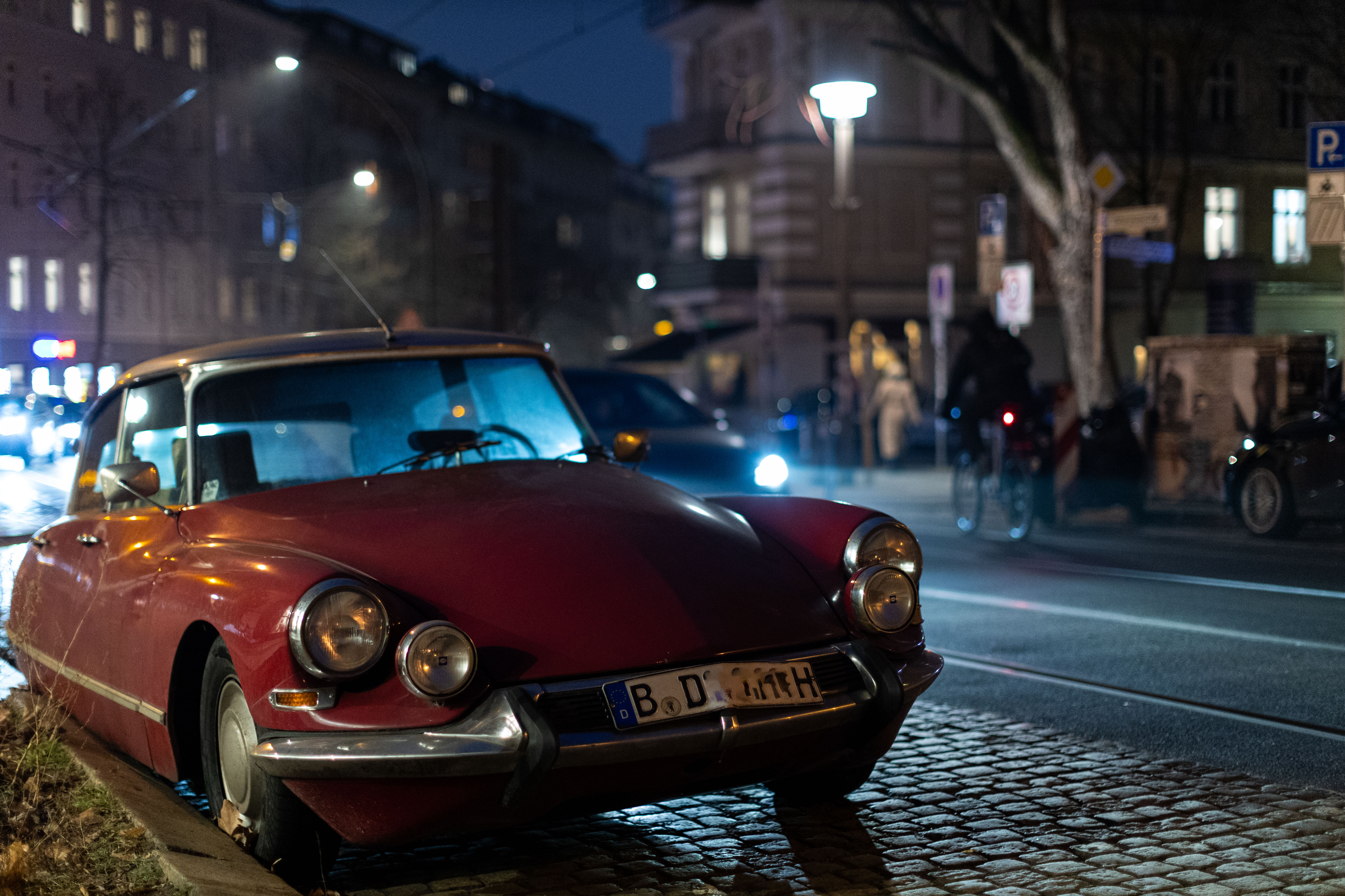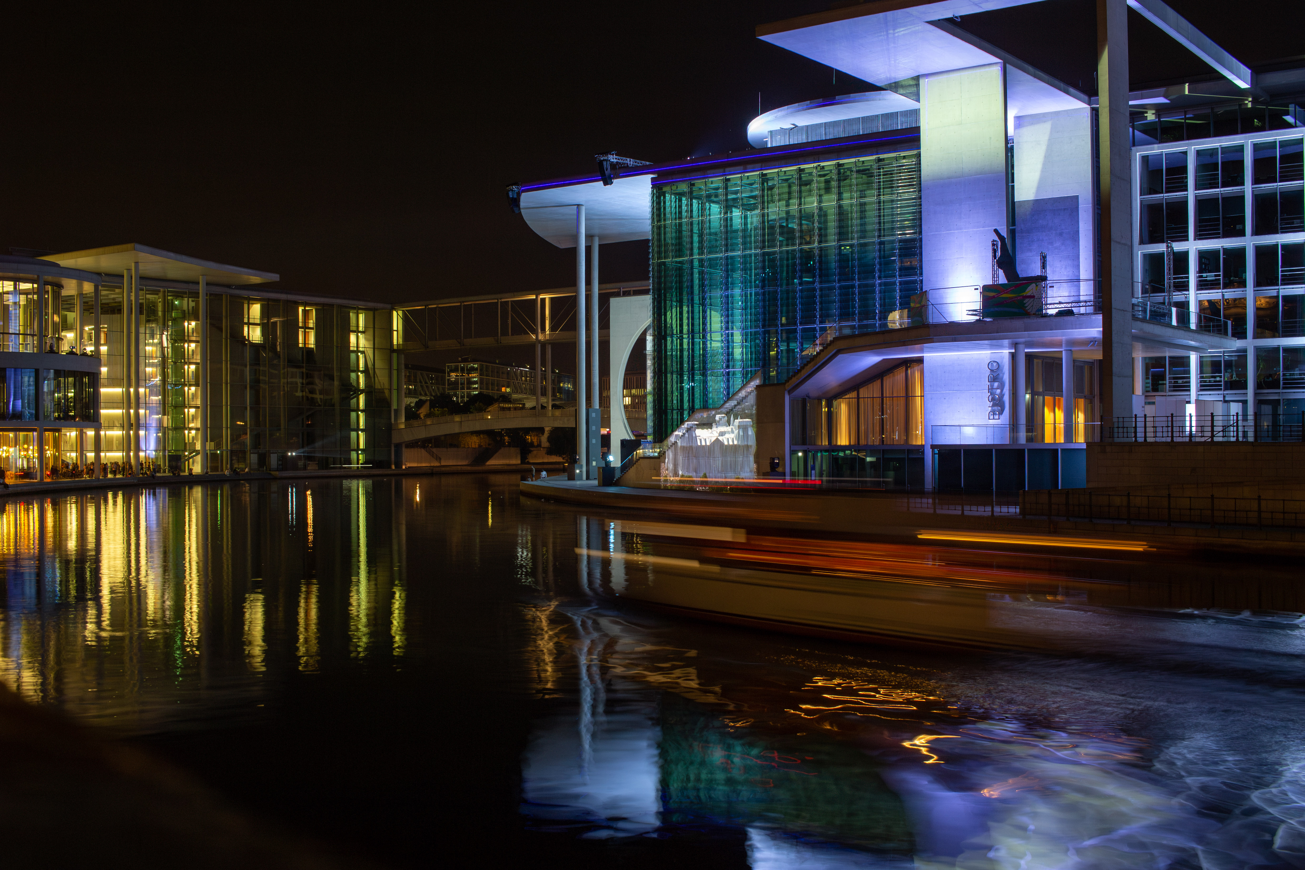The image captures a serene night scene in Berlin, Germany, with the Berliner Sky Tower prominently displayed against a dark blue sky. The tower, illuminated in blue, stands tall on the left side of the frame, with its spire reaching towards the sky. The Berliner River, reflecting the city's lights, flows on the right side of the image. The buildings, mostly dark in color, are illuminated by streetlights, creating a warm glow. The perspective is from a high vantage point, looking down on the river and the tower, emphasizing the tower's height and prominence. The image is a beautiful representation of Berlin's skyline at night.