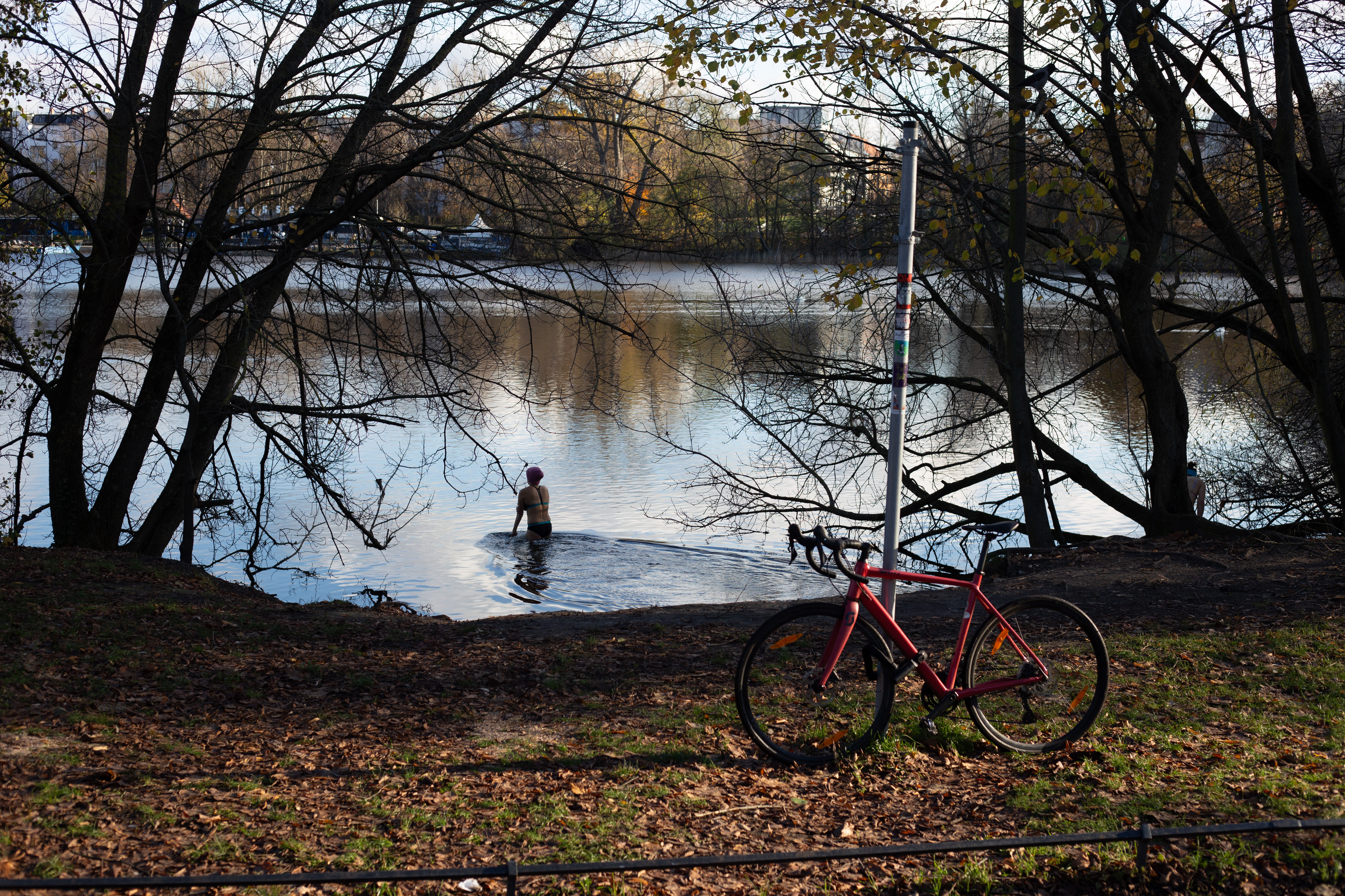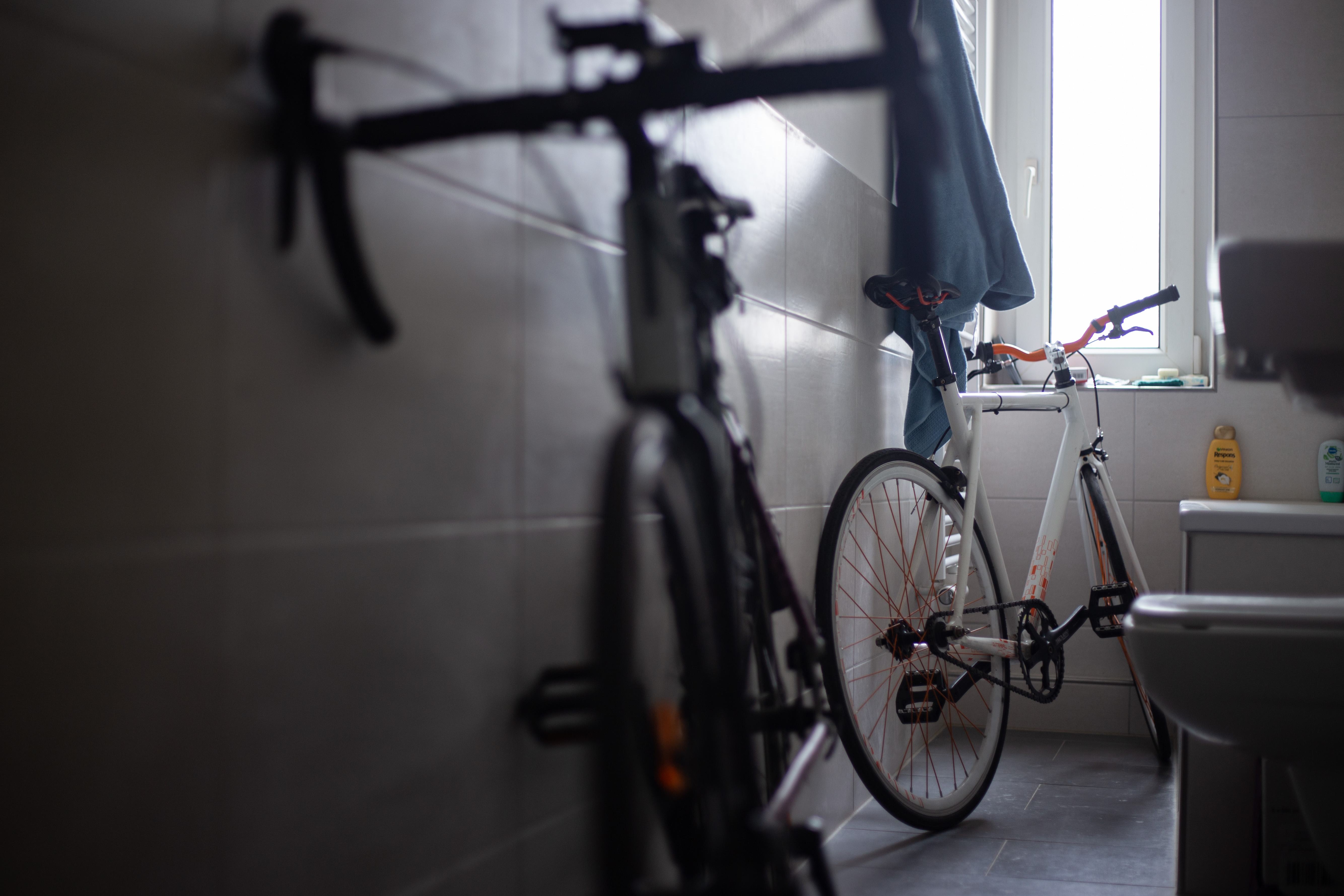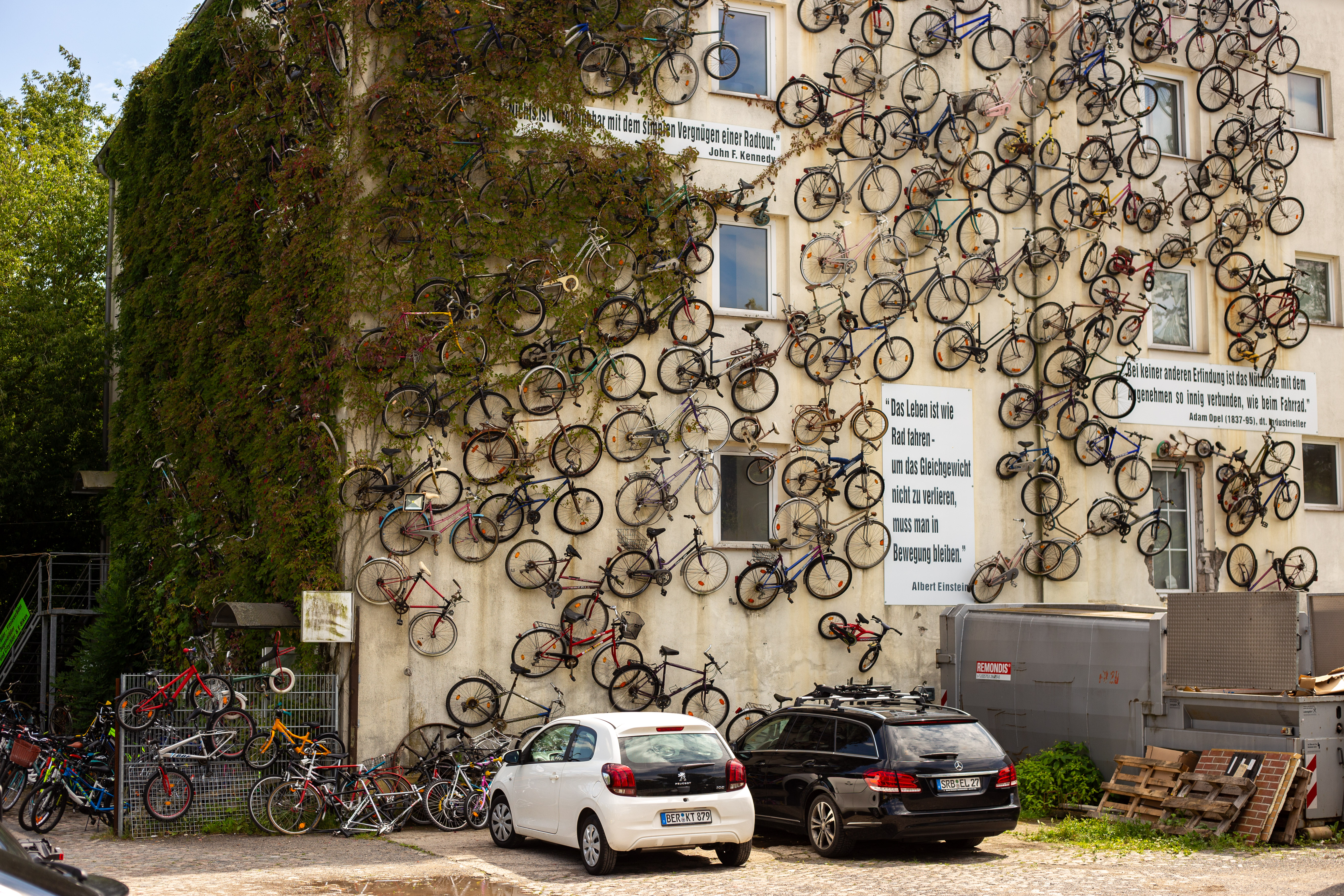 The image features a white building adorned with a unique, moss-covered wall of bicycles, creating a unique and artistic atmosphere. The building has a sign that reads "Vilničáská a říčáská" and "Vilničáská a říčáská" in Czech, indicating the building's location in the Czech Republic. The perspective of the image is from a low angle, emphasizing the height of the building and the bicycles. In the foreground, there are parked cars and a white car, adding to the urban setting. The image captures a blend of nature and urban life, with the bicycle wall serving as a unique and artistic landmark.
