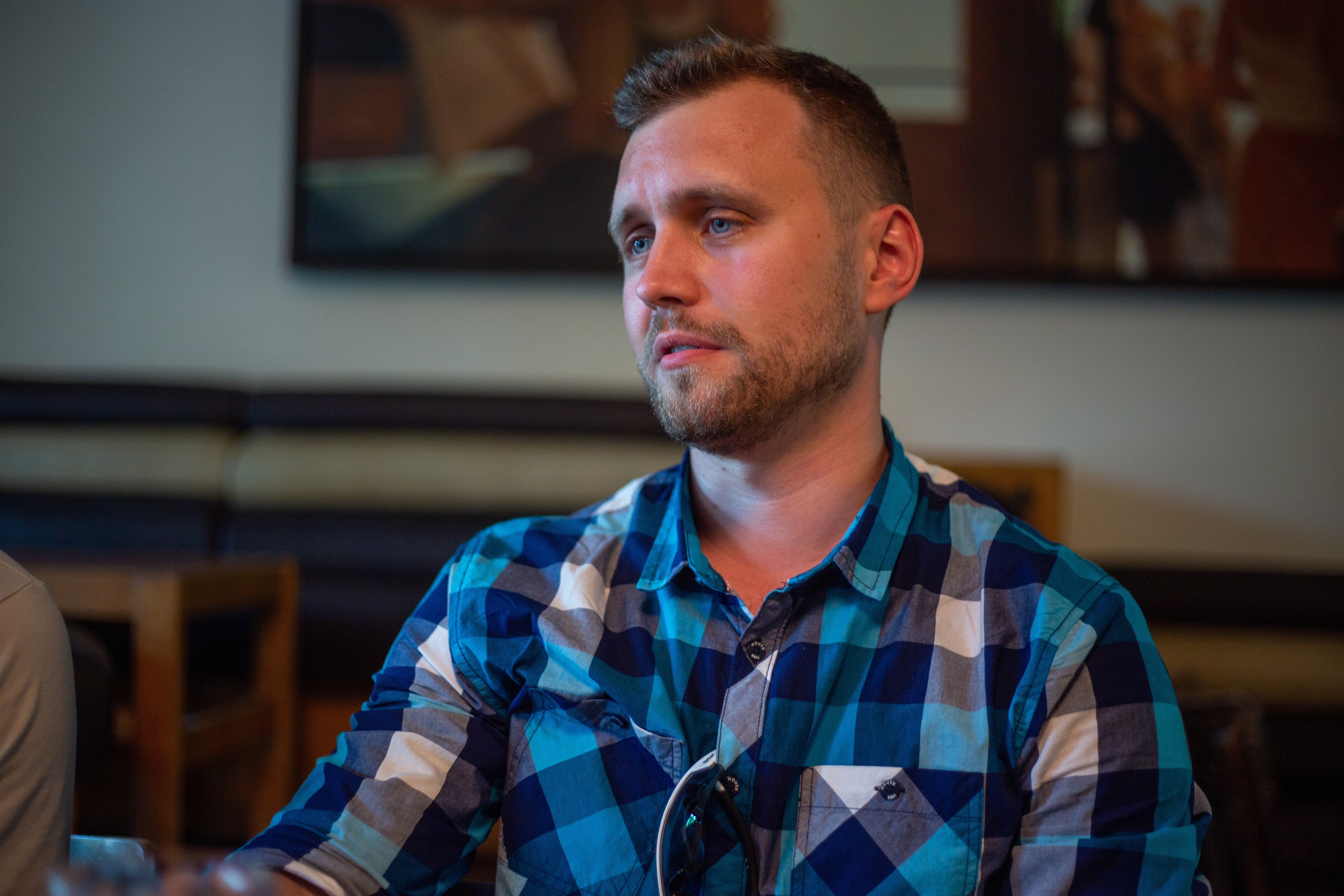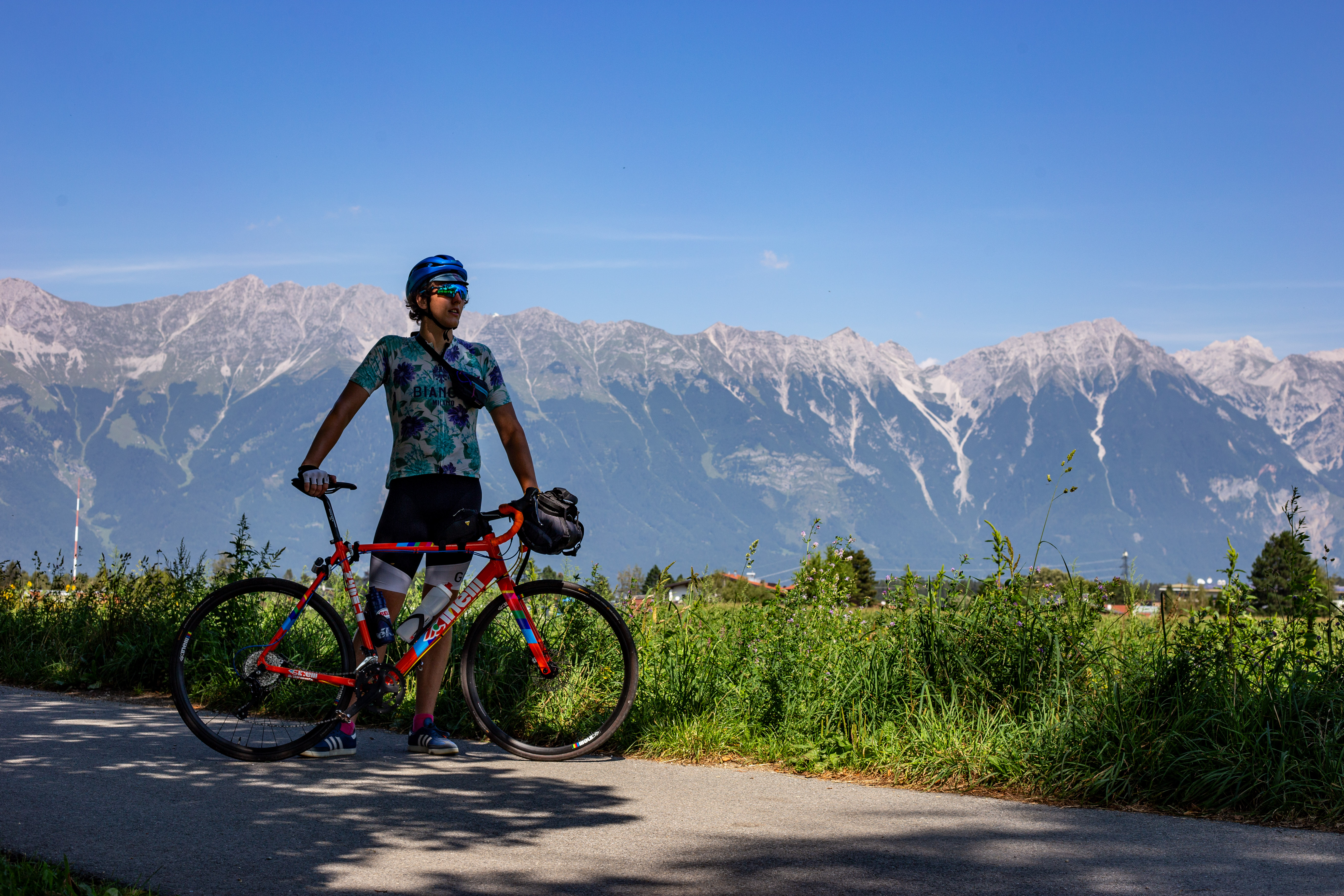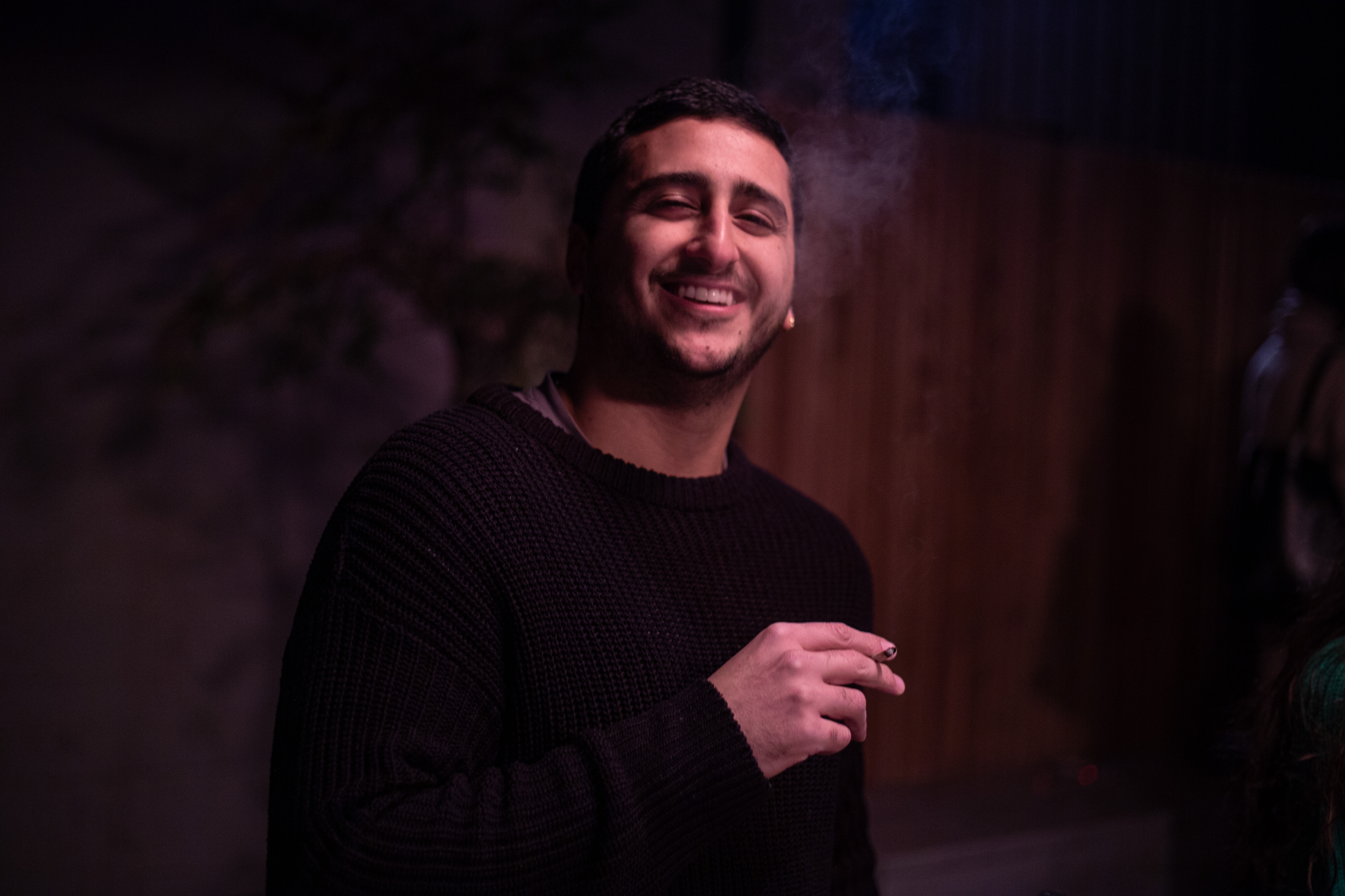 In this image, actress Emma Stone is captured in a moment of tranquility amidst a bustling cityscape. She stands on a ledge, her gaze directed upwards towards the city skyline. Dressed in a blue and beige sweater, a black turtleneck, and blue jeans, she exudes a sense of calm and solitude. A beige purse is slung over her shoulder, and a pair of earrings adorns her ears. Her hair is styled in a loose bun, and she smiles, adding a touch of warmth to the scene. The cityscape in the background is a mix of buildings and trees, creating a dynamic backdrop for her serene moment.
