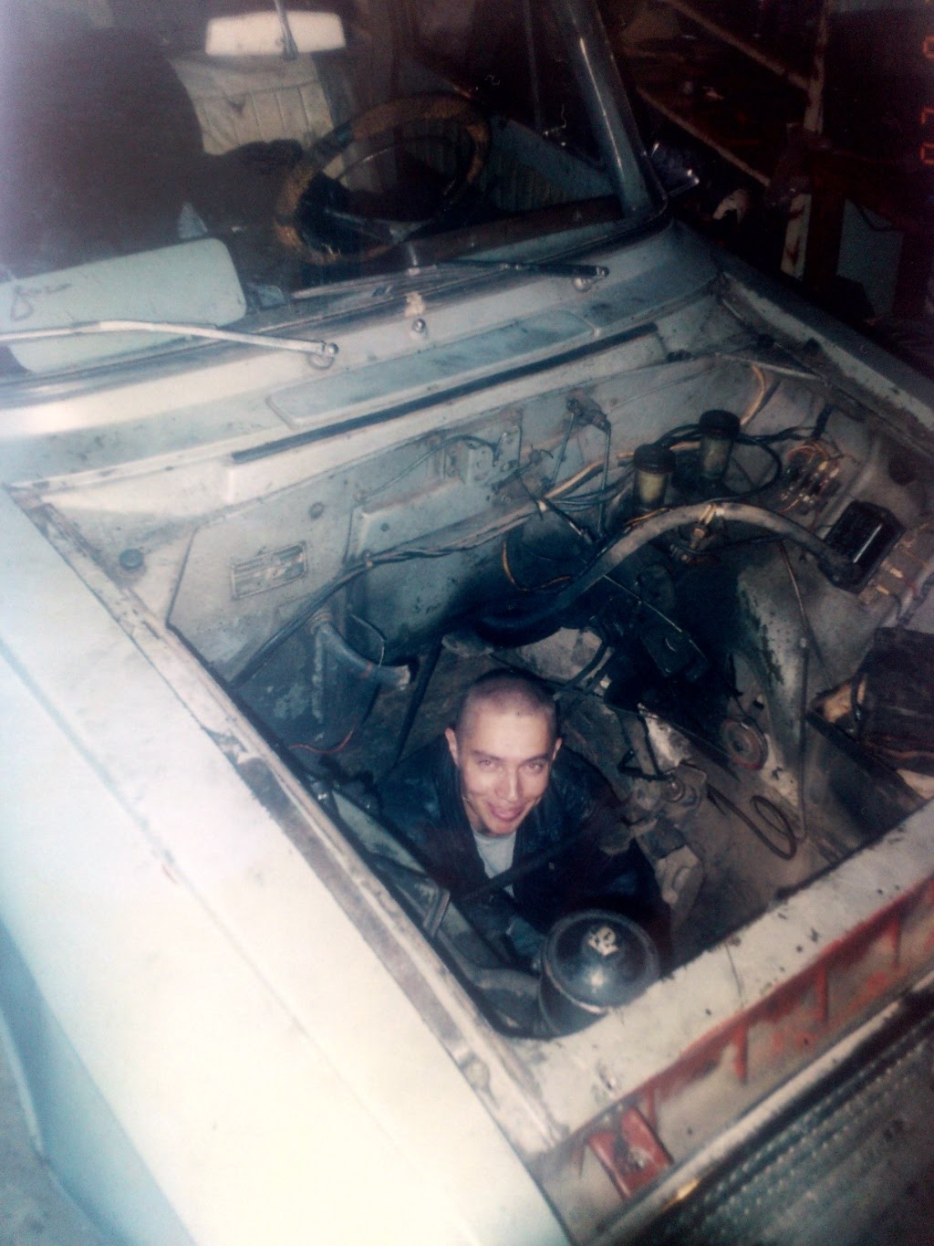A man in a black jacket and glasses is seated inside a car, surrounded by a cluttered interior with various objects like a radio, a steering wheel, and a gas tank.