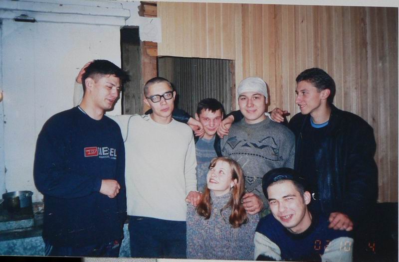A group of young men and women posing together in a room with wooden walls and a window.