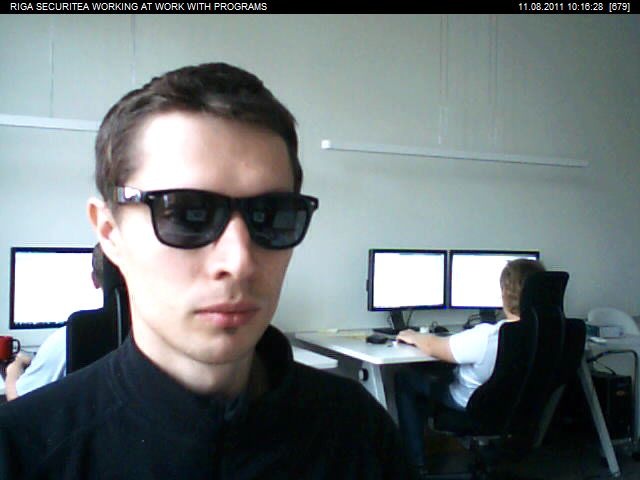 A man wearing sunglasses and a black shirt is sitting at a desk in an office, with a woman working at a computer monitor behind him.