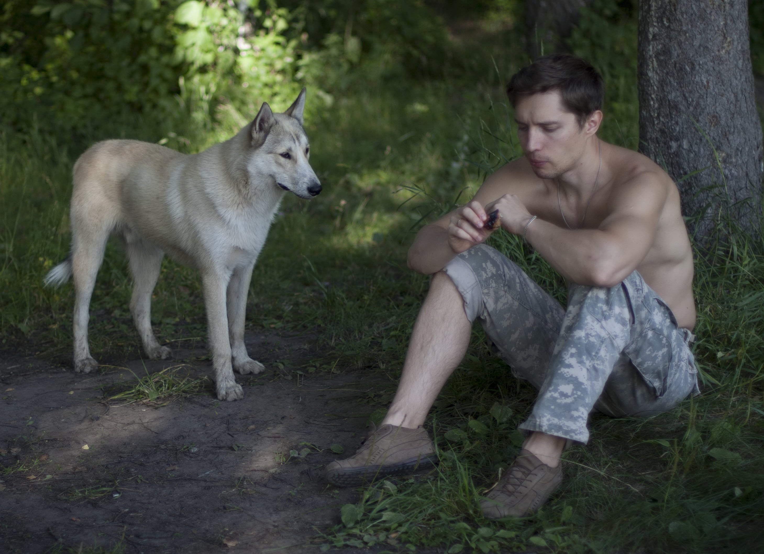 A shirtless man in camouflage shorts and brown shoes sits on the ground, holding a cell phone, while a white husky stands nearby, looking at him.
